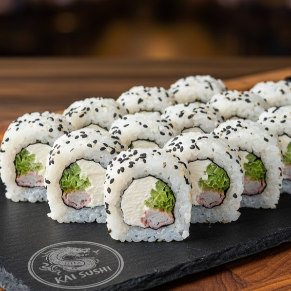 Rollo blanco relleno de surimi, pepino y queso crema, ajonjoli por fuera.