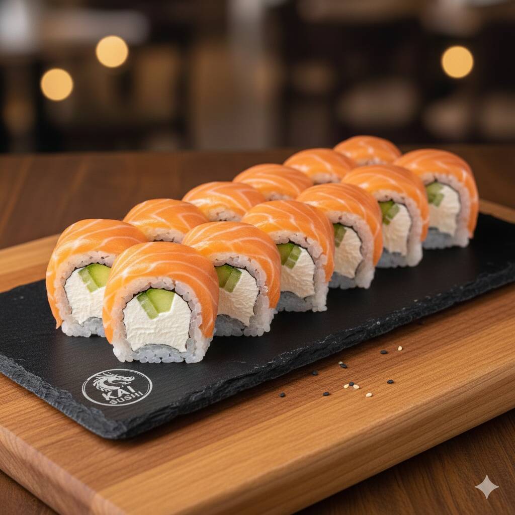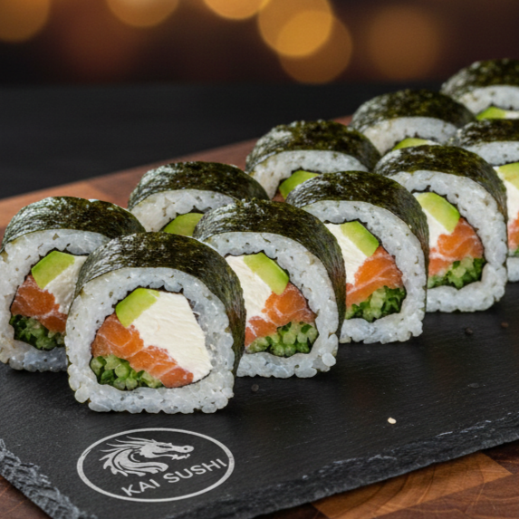 Relleno de queso crema, aguacate y pepino, por fuera envuelto con salmón.