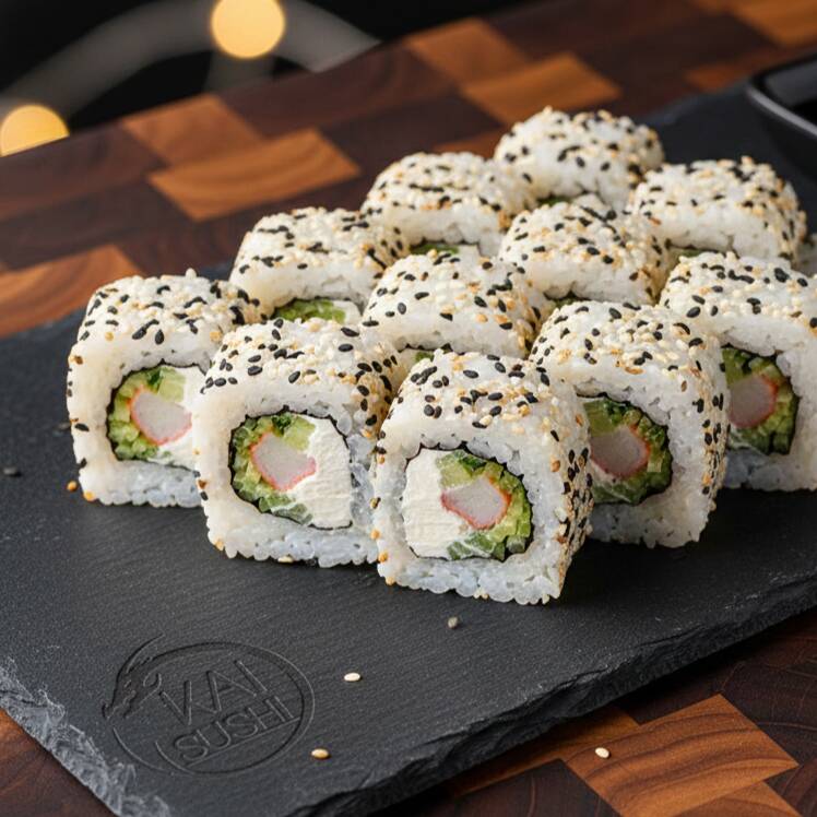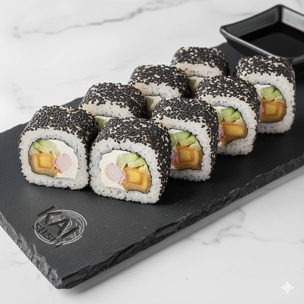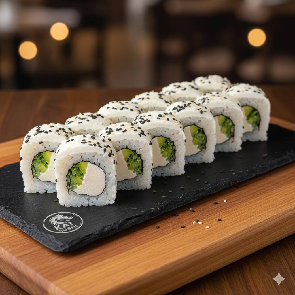 Rollo blanco relleno de camarón, queso crema y pepino y ajonjoli negro por fuera.