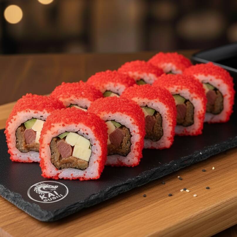 Relleno de queso crema, aguacate, camarón empanizado con panko y bañado en salsa de anguila.