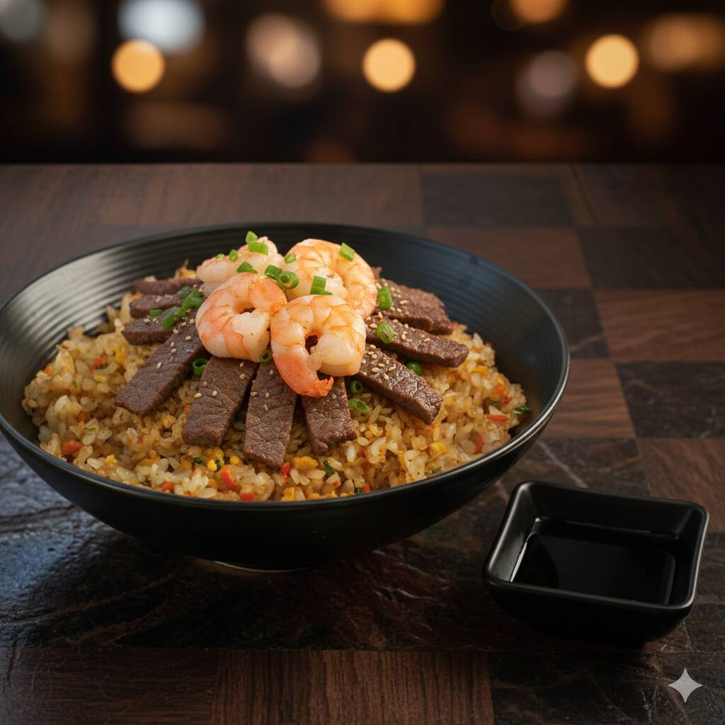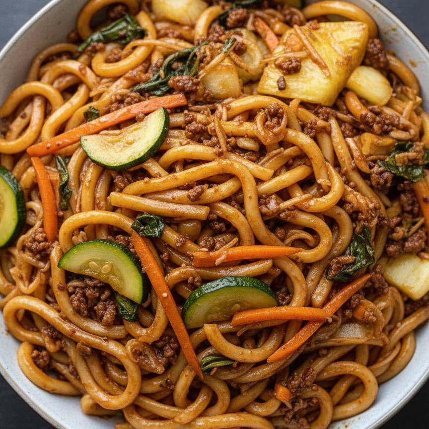 Yakiudon de arrachera y camarón con calabaza y zanahoria.