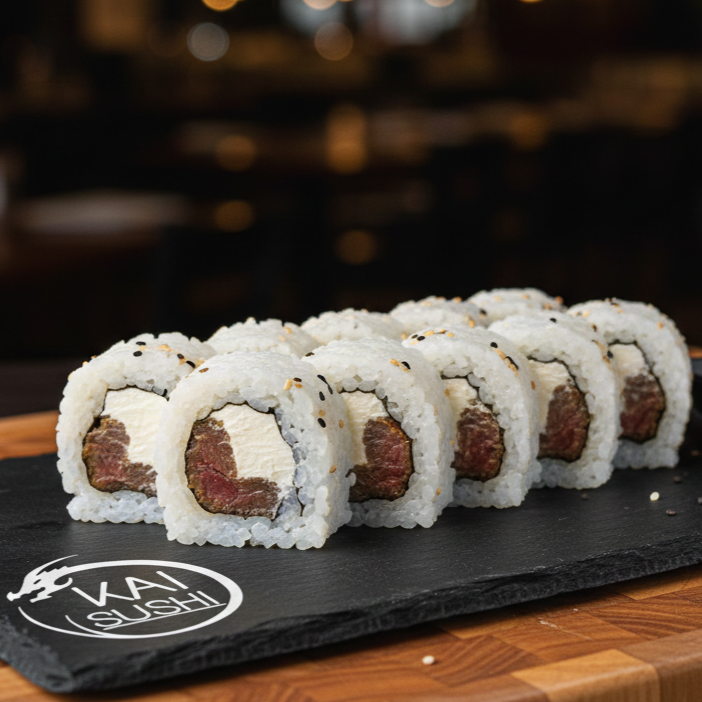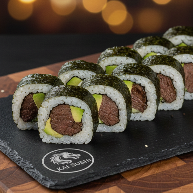 Rollo con alga por fuera relleno de arrachera, aguacate.