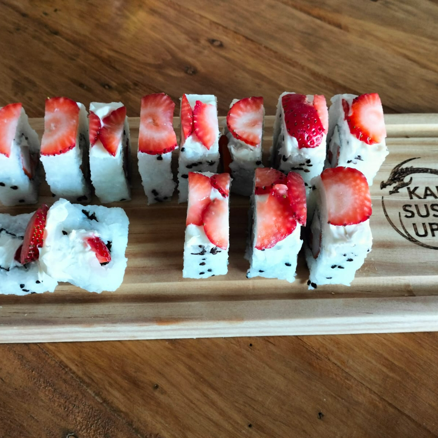 Rollo blanco relleno de queso crema, surimi, fresa, por fuera queso crema, ajonjoli y fresa.