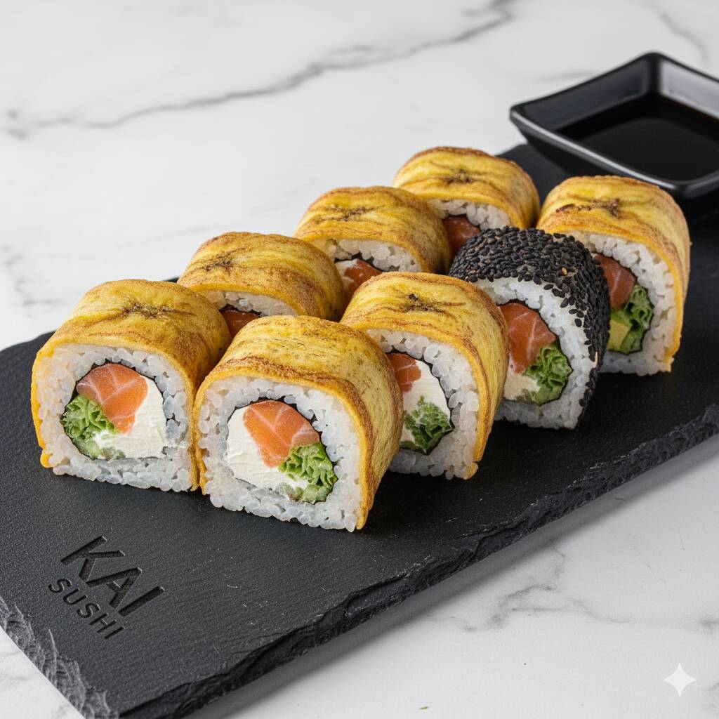 Rollo con surimi, queso crema, pepino y plátano macho frito.