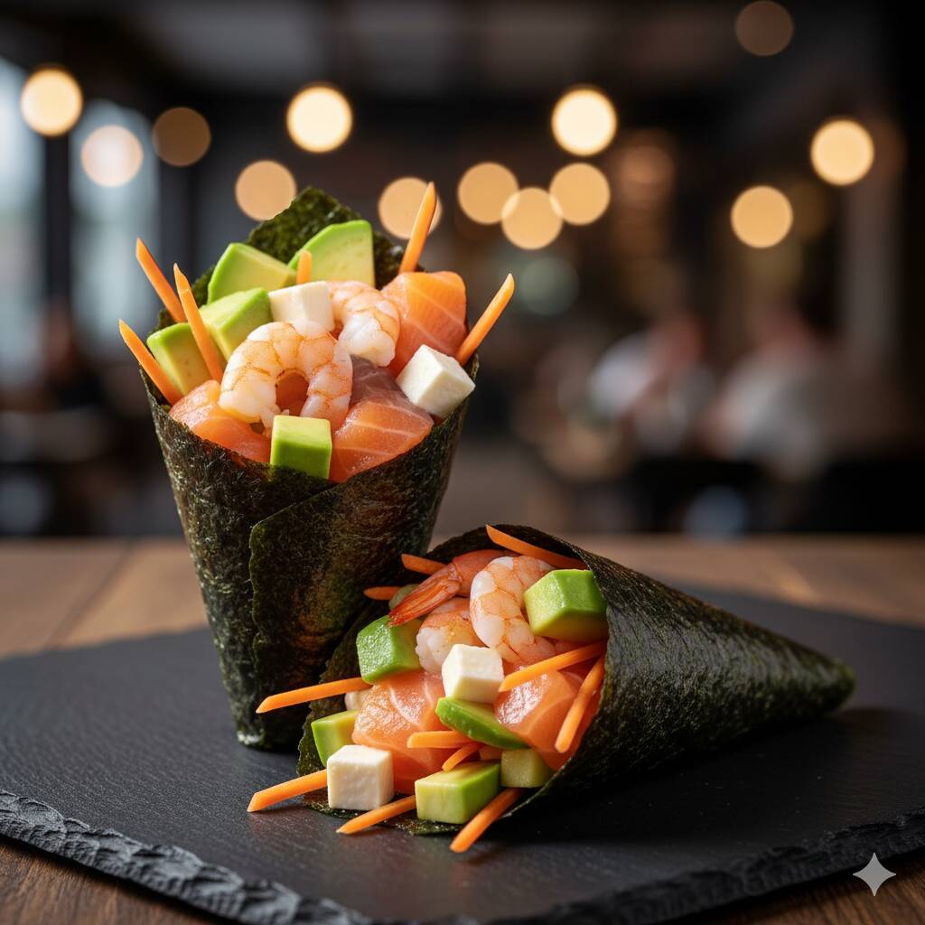 2 conos de alga nori relleno de aguacate, zanahoria, queso crema, camarón y salmón.