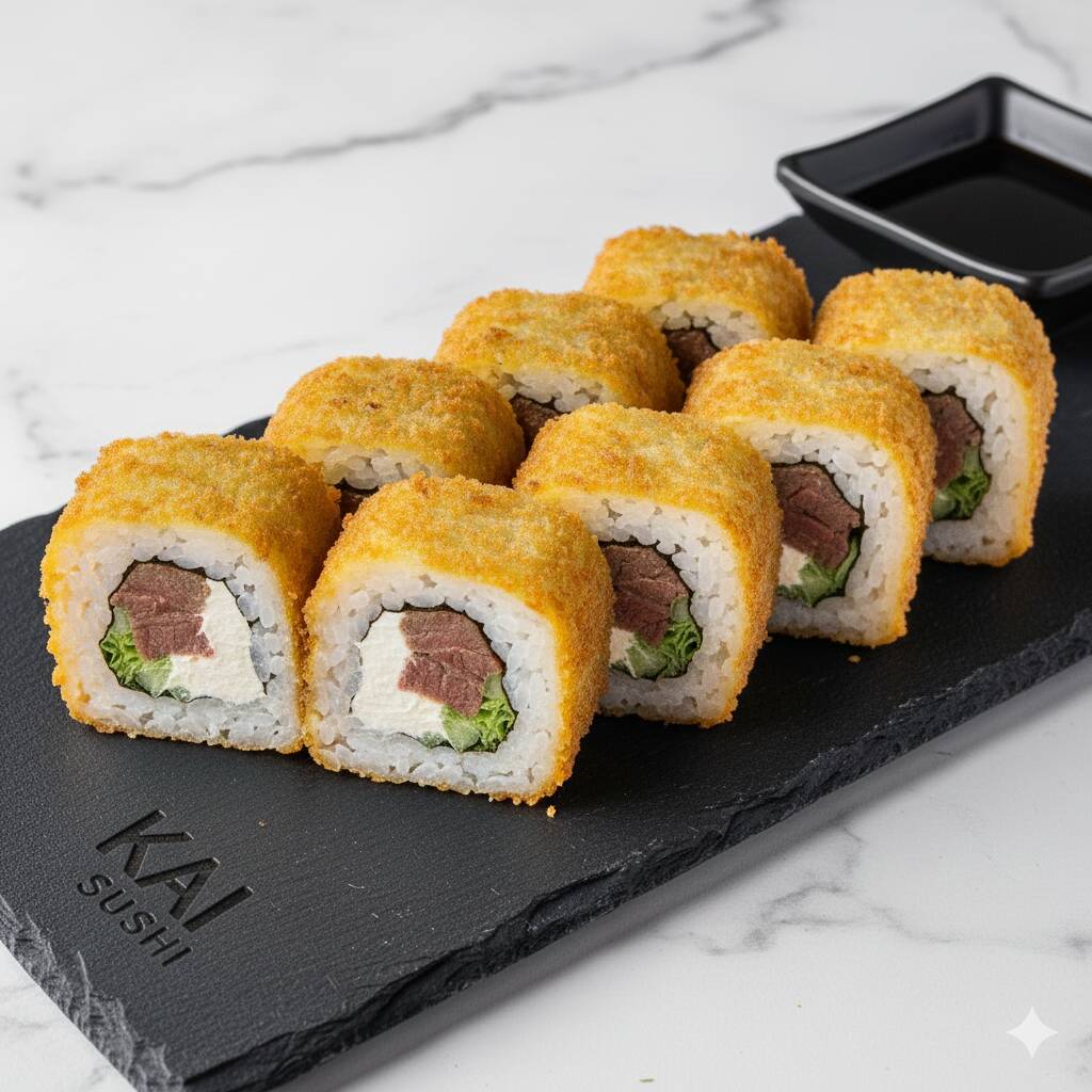 Rollo empanizado con arrachera, queso crema, pepino y aguacate.