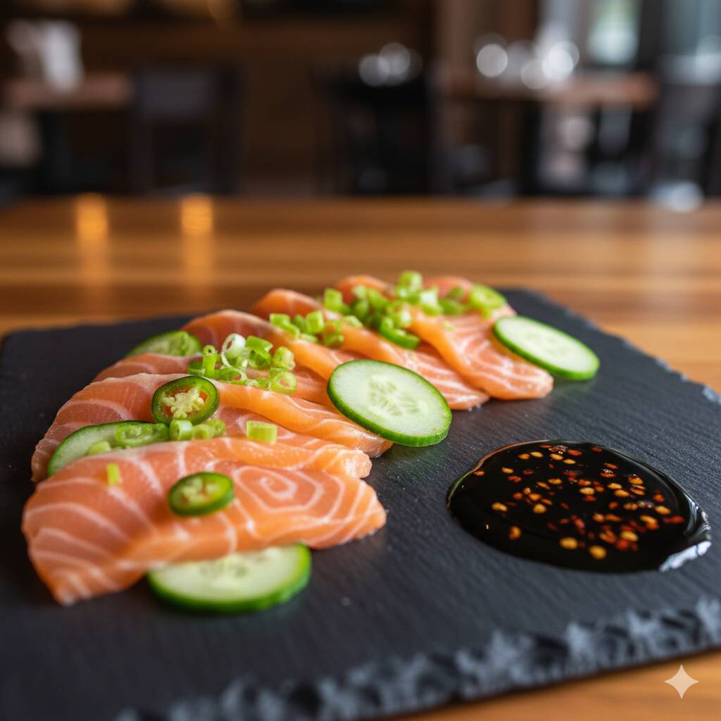 Láminas de salmón con soya con chile, pepino, chile serrano y cebollín.