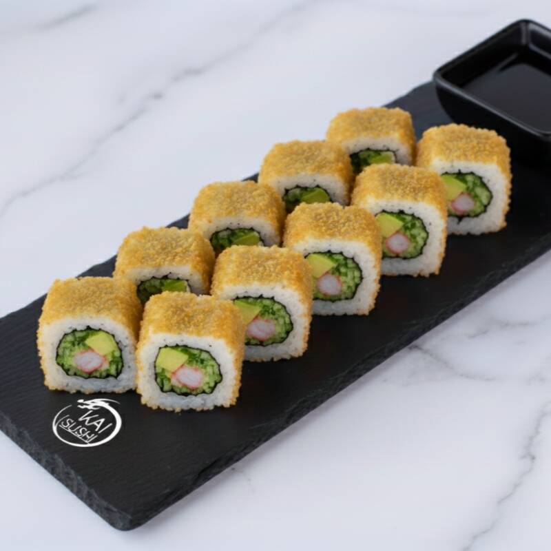 Rollo empanizado con pescado, queso manchego, pepino y aguacate.