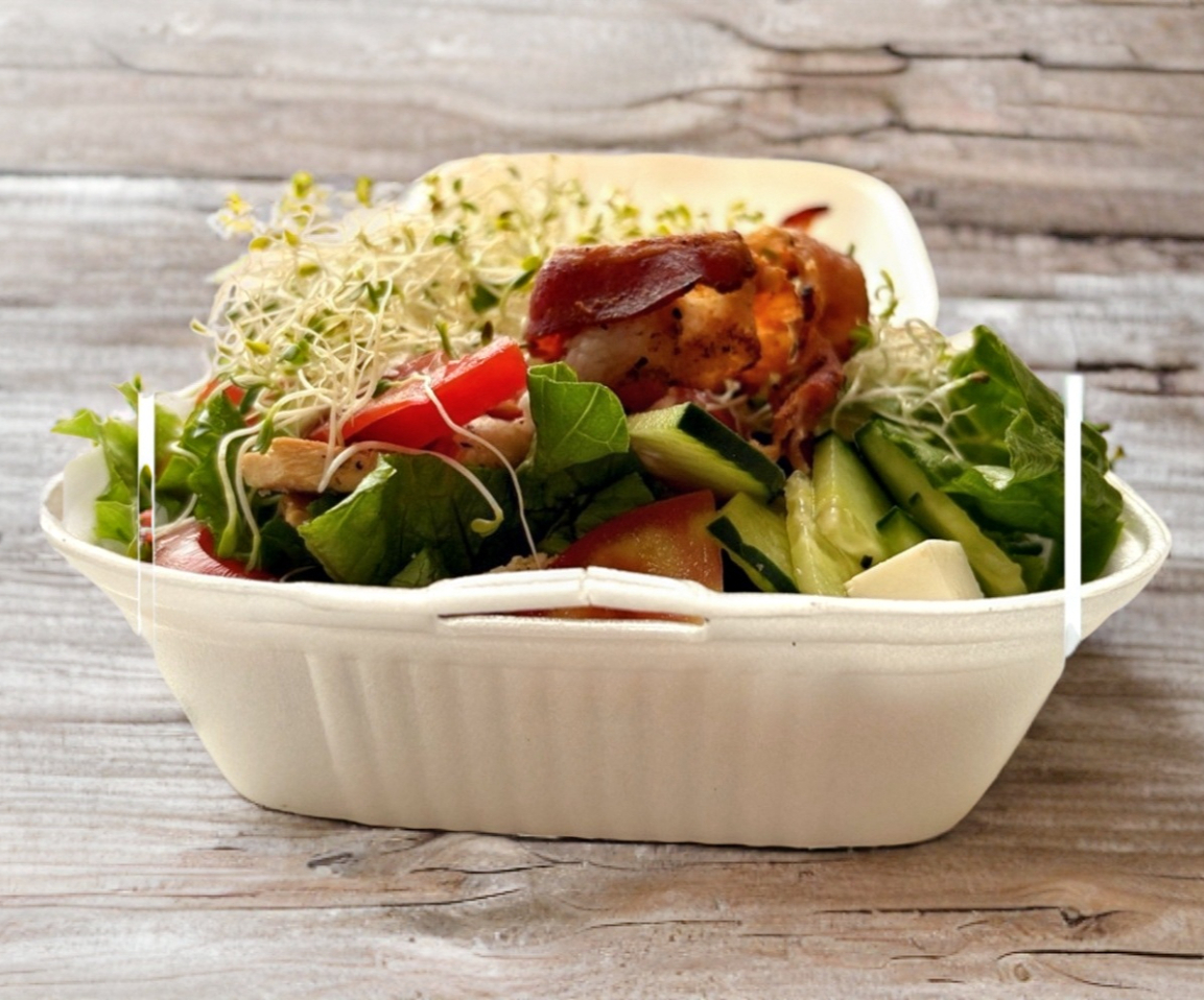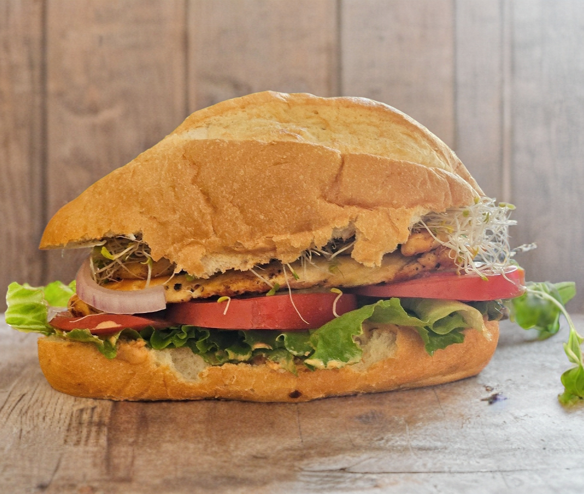 El clásico de la casa con pechuga asada, germinado de trigo, pepino, jitomate, tocino y un toque de mayonesa de chipotle.