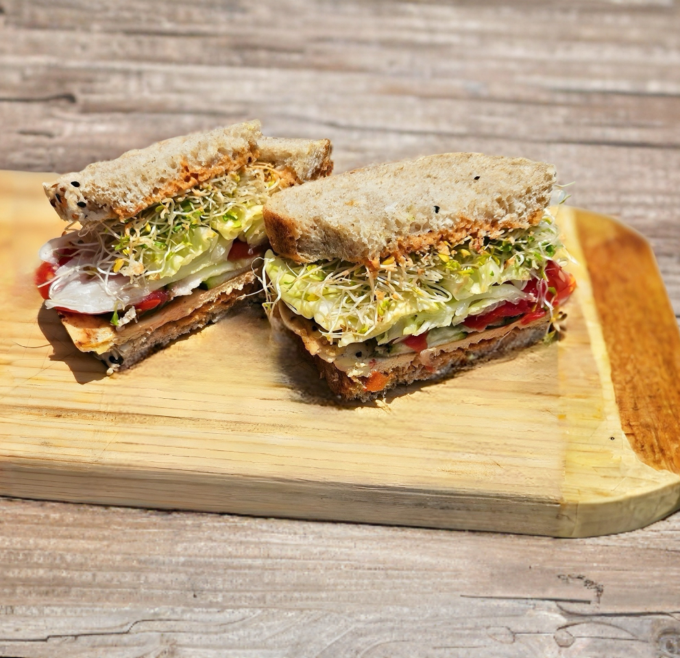 Pan artesanal horneado diariamente con pechuga asada, germinado de trigo, jitomate, pepino, y un toque de mayonesa de la casa.