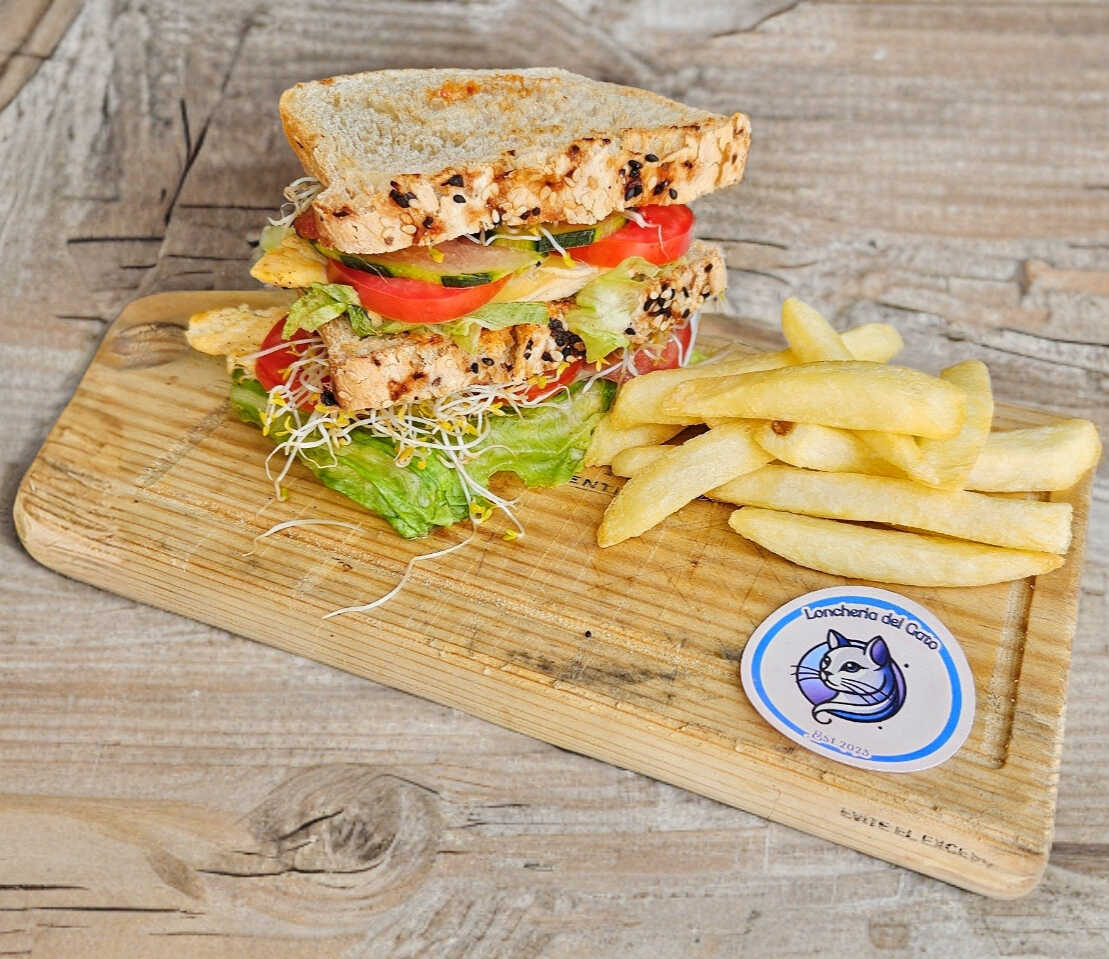 Hecho en 3 rebanadas de pan blanco casero con pechuga de pollo asada, germinado de trigo, pepino, jitomate, mayonesa de chipotle y media orden de papas estilo holandés crujientes.