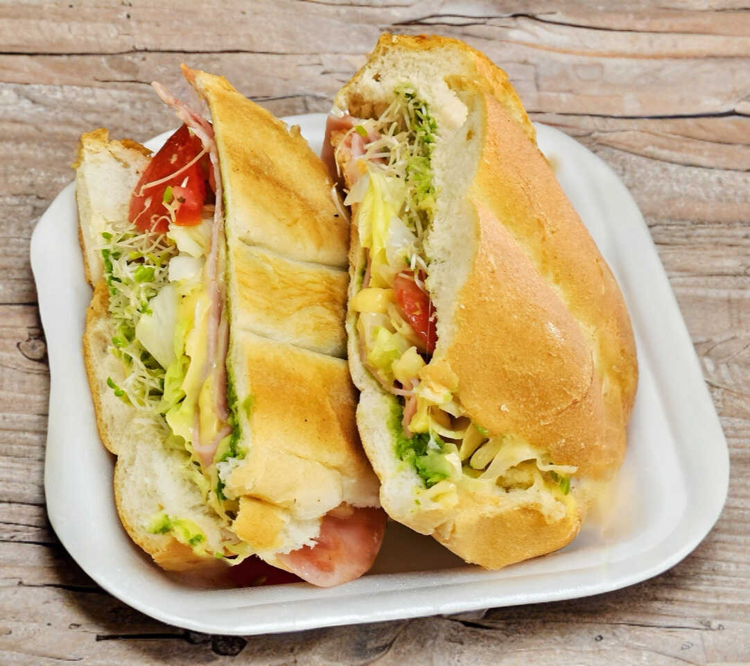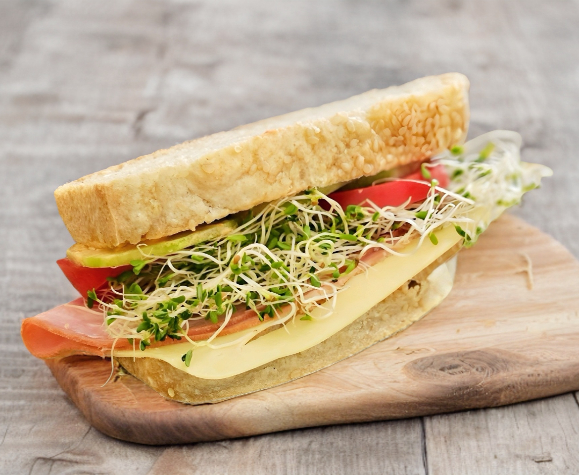 Pan artesanal horneado diariamente, con jamón de pierna, jitomate, germinado de trigo, pepino y mayonesa de chipotle.