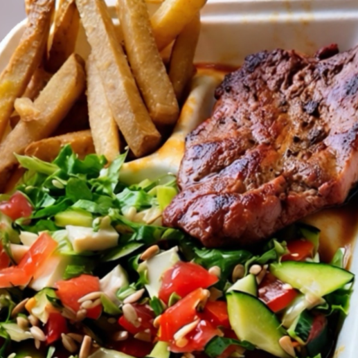 120 gramos de arrachera marinada, media porción de papas estilos holandes y ensalada con lechuga, pepino, jitomate y aderezo, es una comida completa y deliciosa