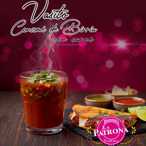 Delicioso consomé de birria, ideal para acompañar tus tacos o quesabirrias.