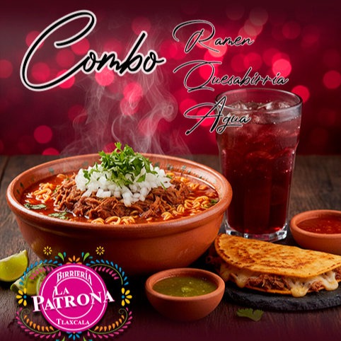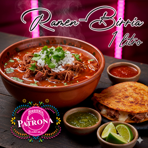 Riquísima fusión del ramen y Birria (no maruchan, lo cual contribuye a conservar el delicioso sabor de la birria y el ramen), incluye limón, cilantro, cebolla, salsa y de obsequio, una deliciosa quesadilla de mozarela.