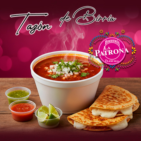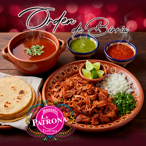 Una orden personal de deliciosa Birria de res, incluye 200 grs de carne, 275 ml. de consomé, 4 tortillas, cilantro, cebolla, limón y salsas.