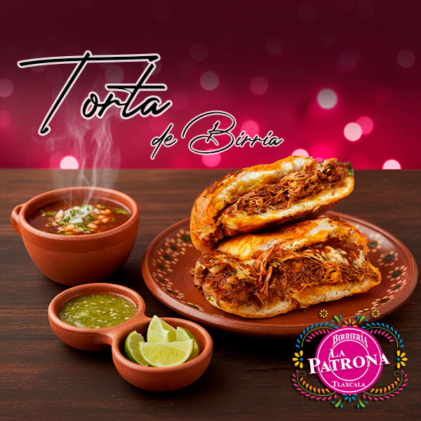 Riquísima torta de Birria, frijoles, costra de queso mozzarella, cebolla y cilantro. Incluye salsa y limones.