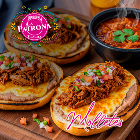 Deliciosos Molletes de Birria, costra de queso Mozarella y pico de gallo.