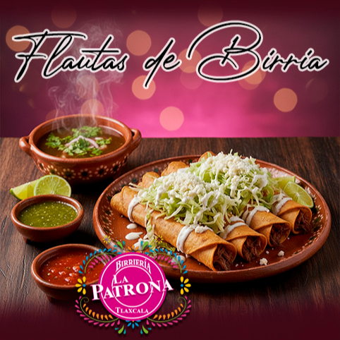 4 deliciosos tacos dorados de Birria (de tortilla tamaño regular 14 cm, acompañadas de lechuga, crema, queso, cilantro, cebolla y salsa.