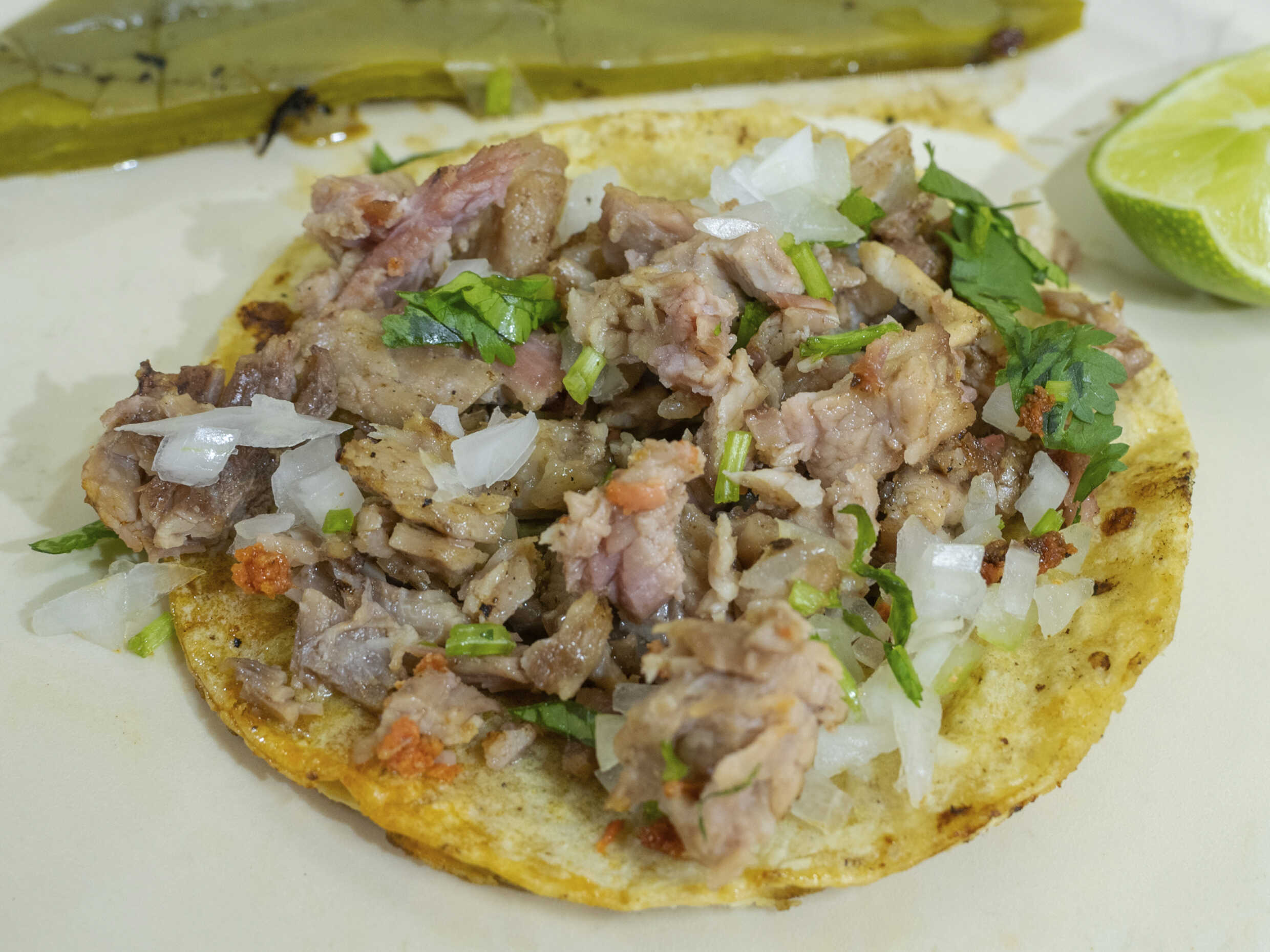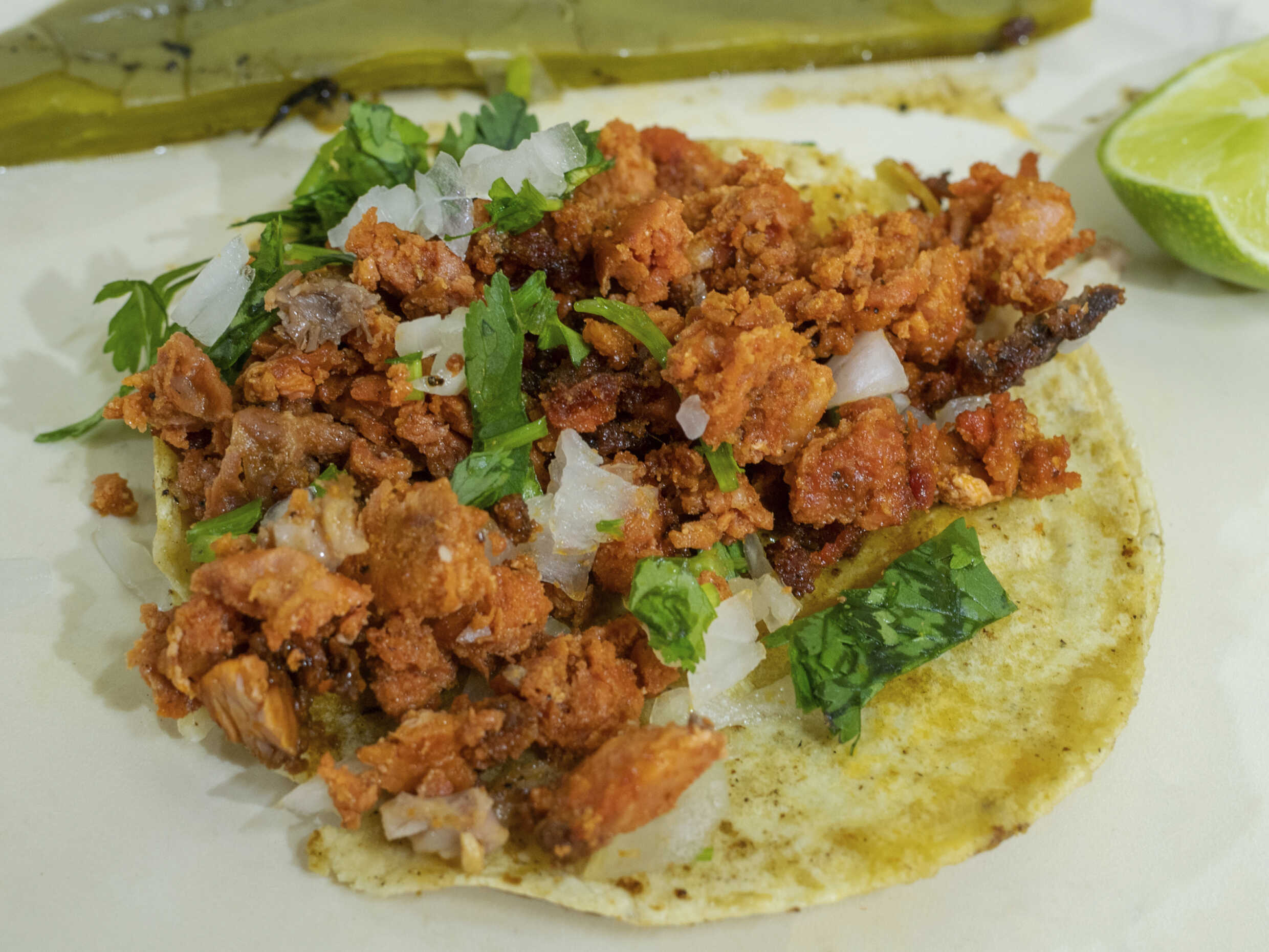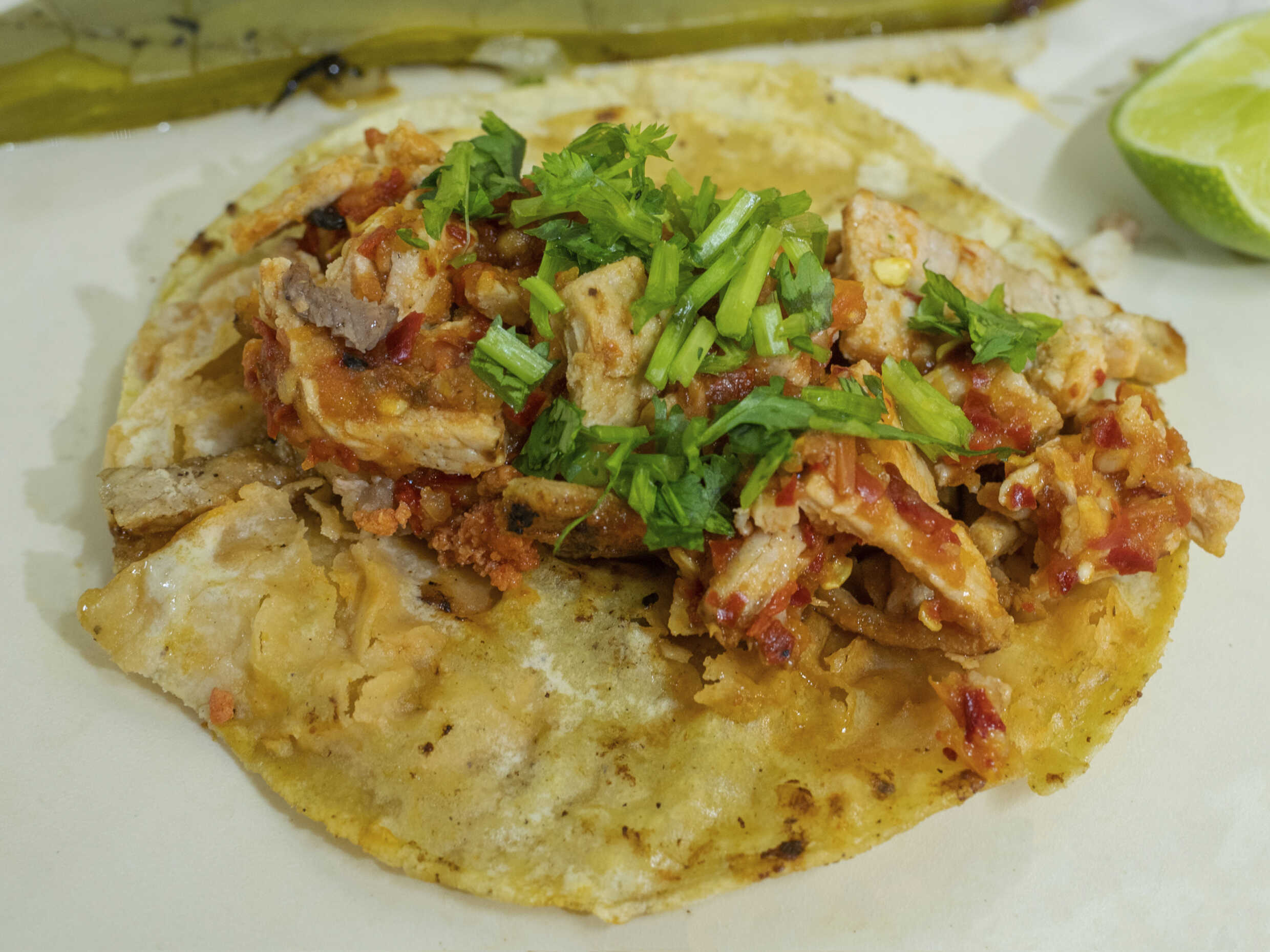 Taco de carne enchilada con chile habanero, chile de árbol y chile de cera