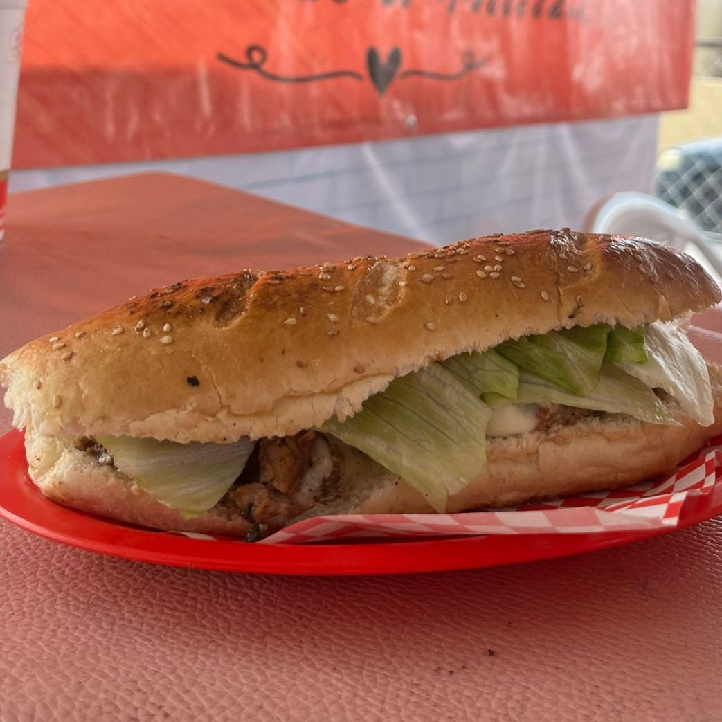 Baguette Clásico Carne de Cerdo Asada al carbón Queso Manchego Aderezo Cebolla y Lechuga