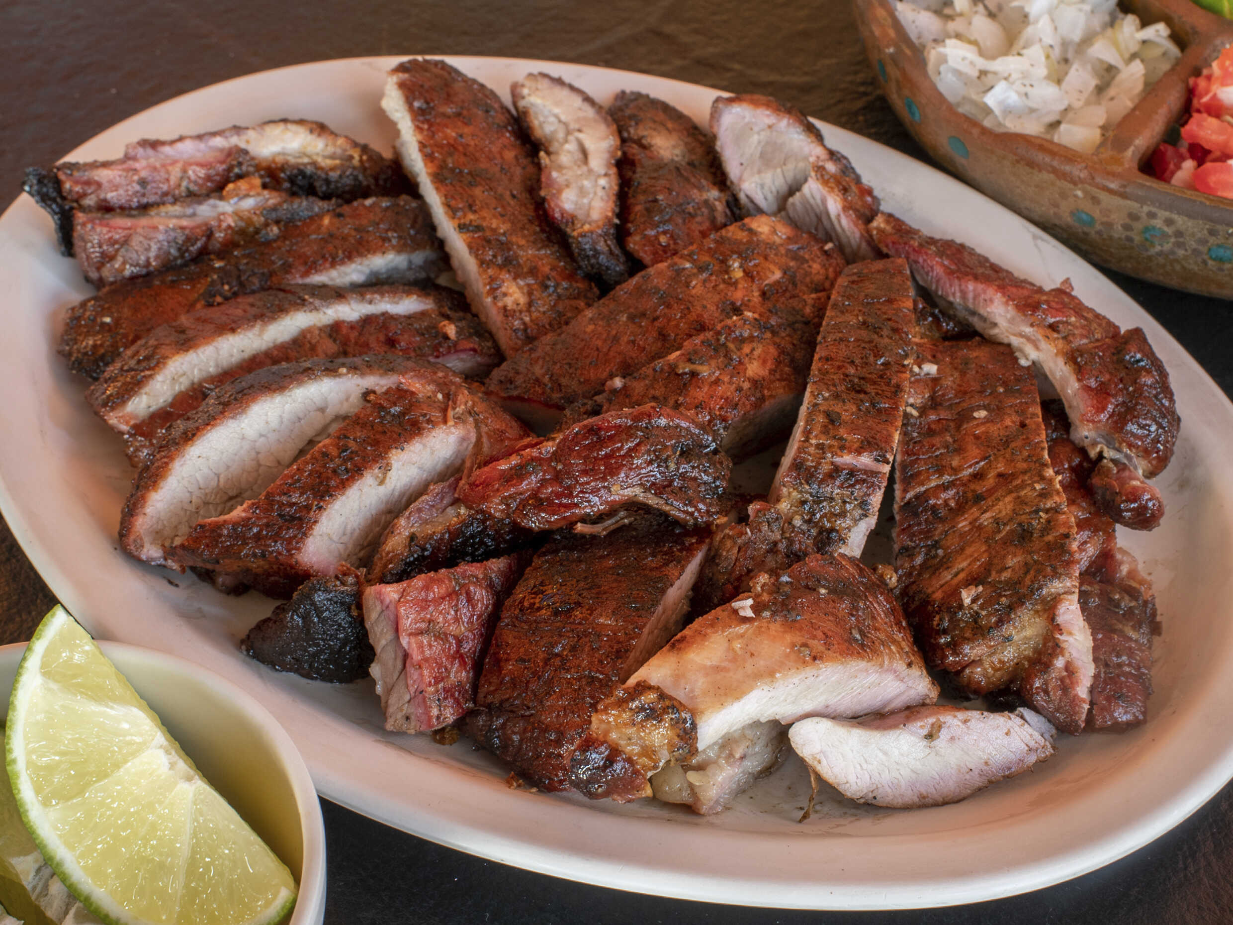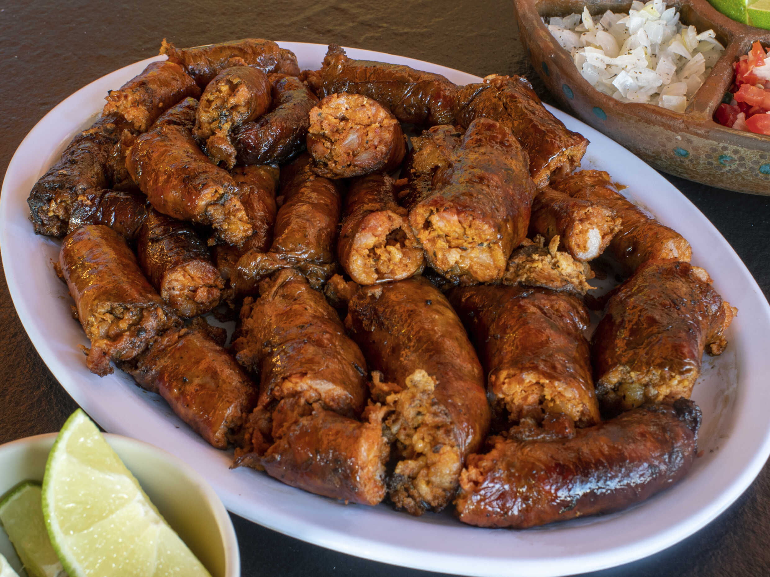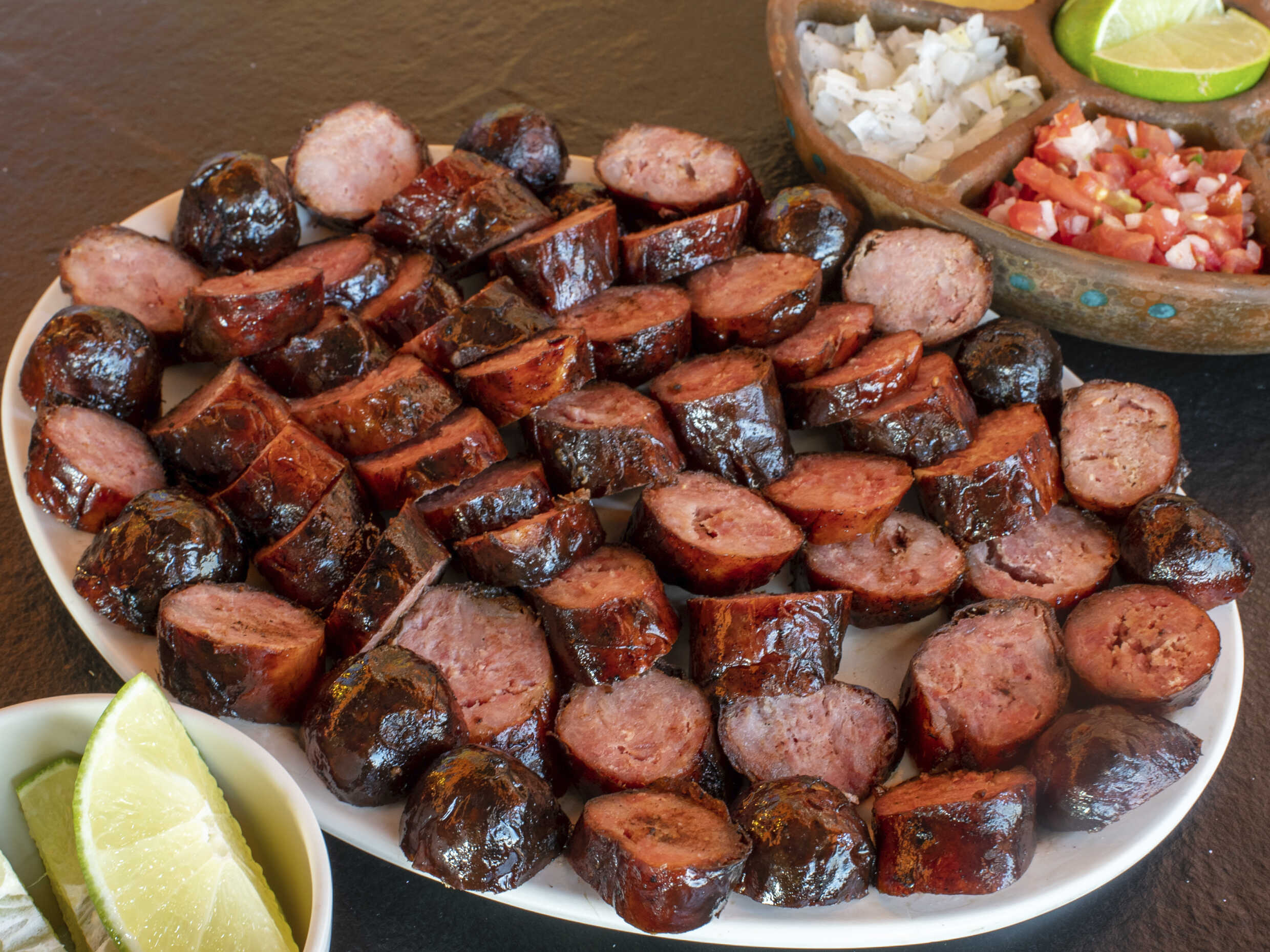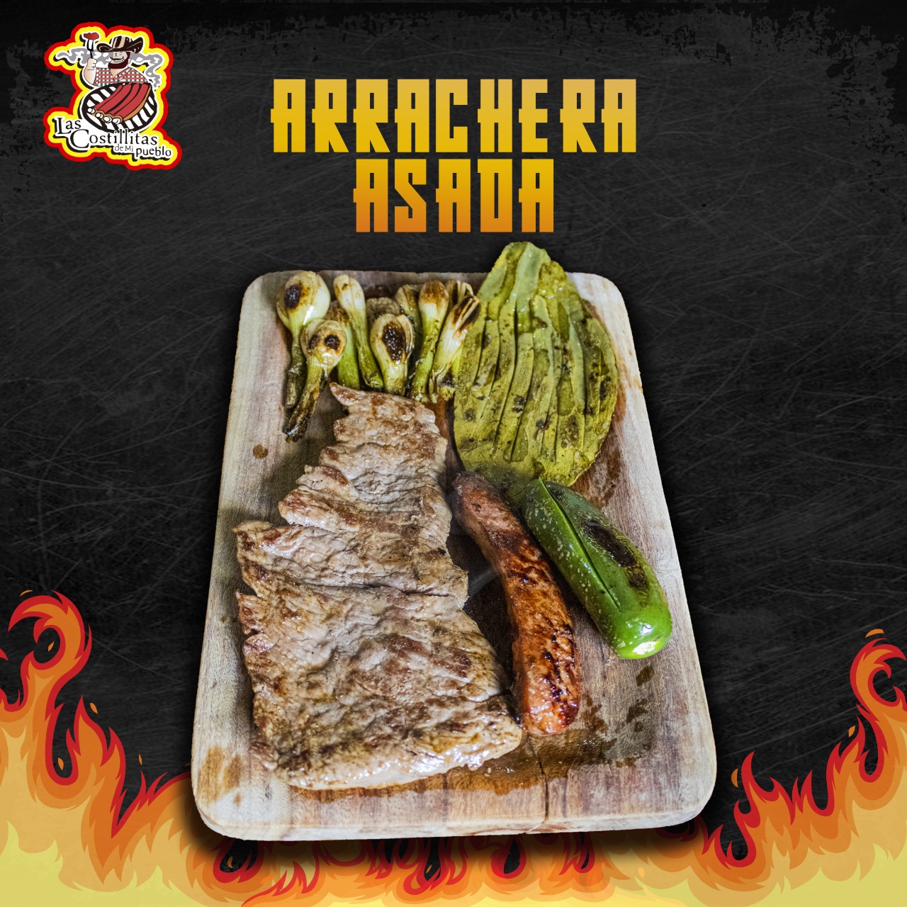 Acompañada de nopal, cebollitas y chorizo argentino.