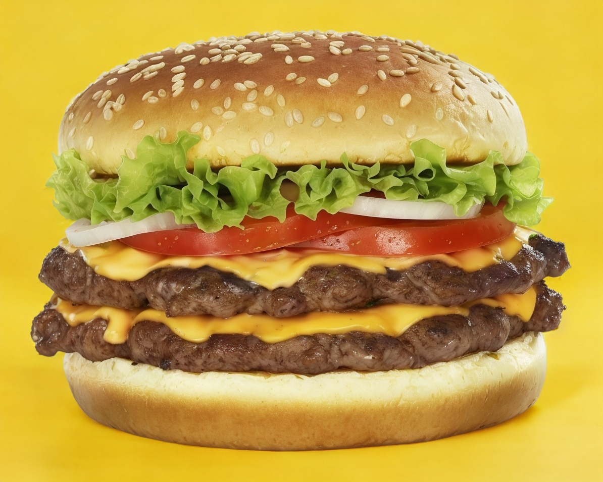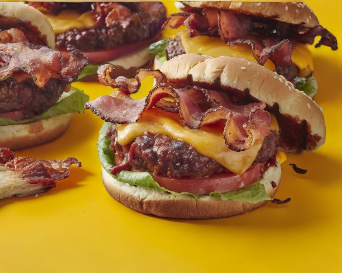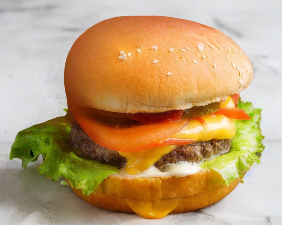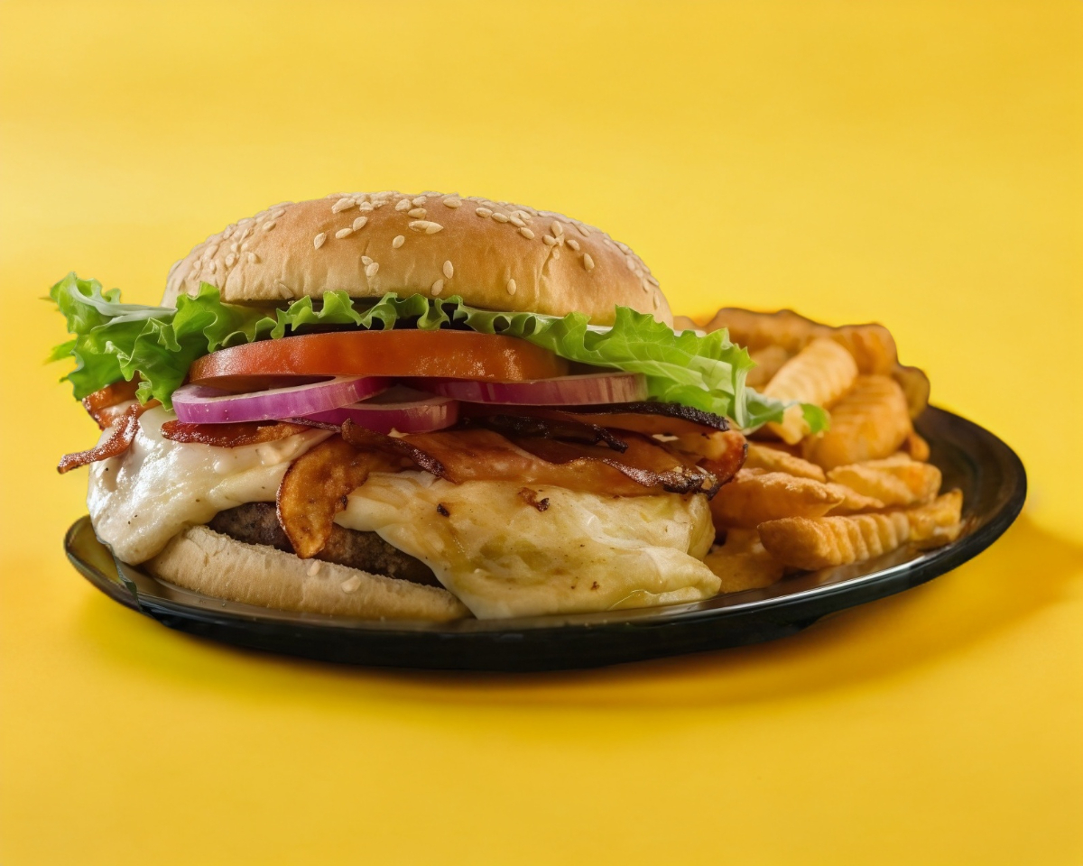 Una hamburguesa con jamón, tocino, 70gr de carne, cebolla caramelizada, jitomate, quesillo y queso amarillo. Acompañada con salsas.