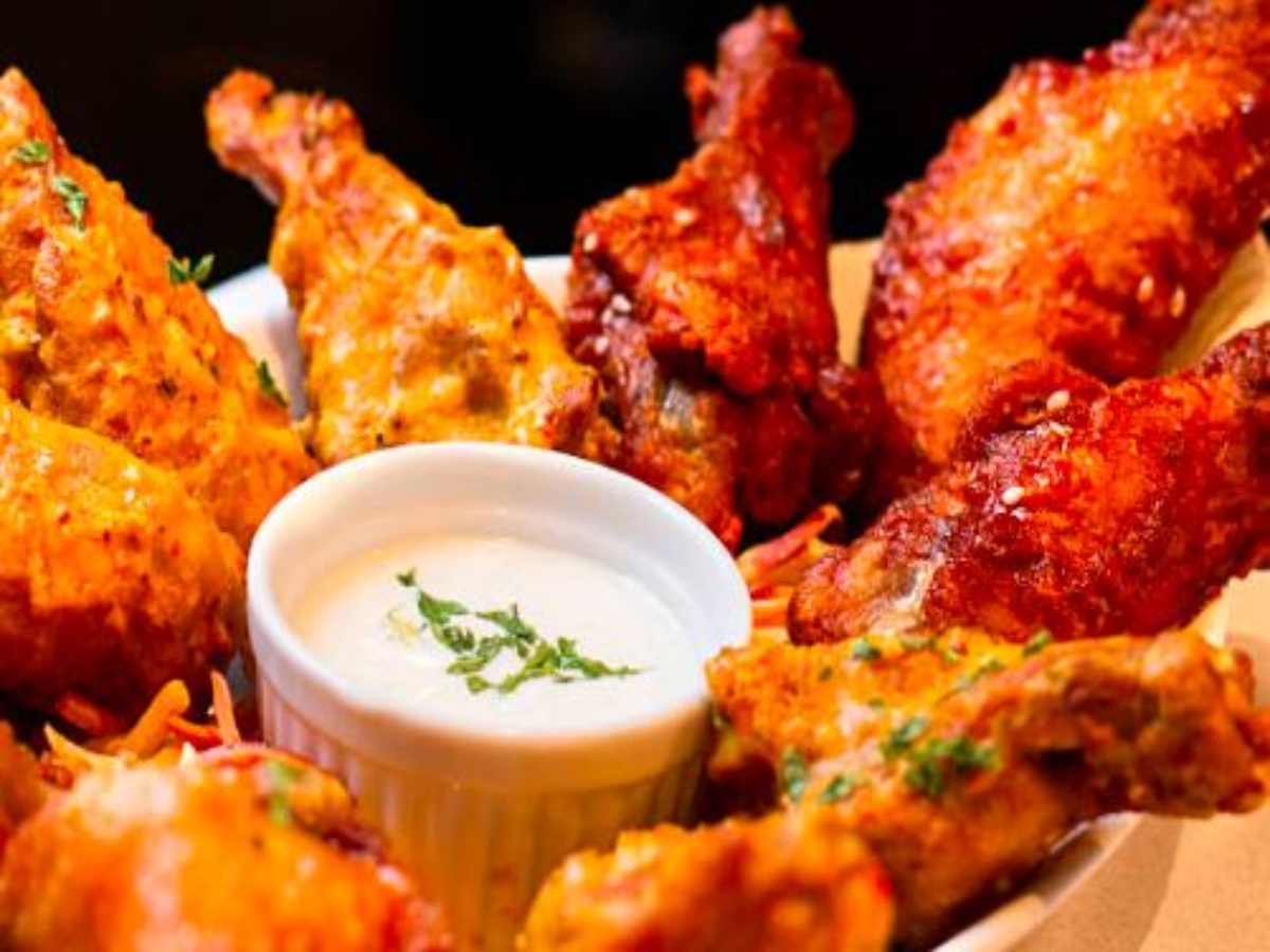 8 Piezas de alitas fritas marinadas con la salsa de tu elección acompañadas con aderezo ranch.