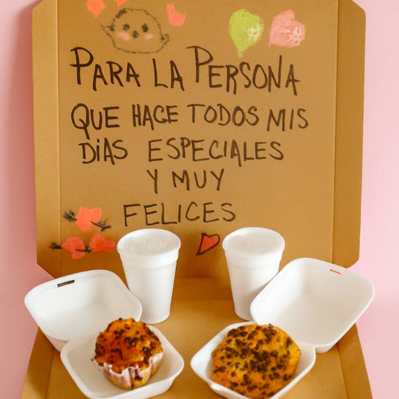 Café Americano • Muffin con chispas o nuez • Galletón de chispas • Agua de avena • Fruta fresca