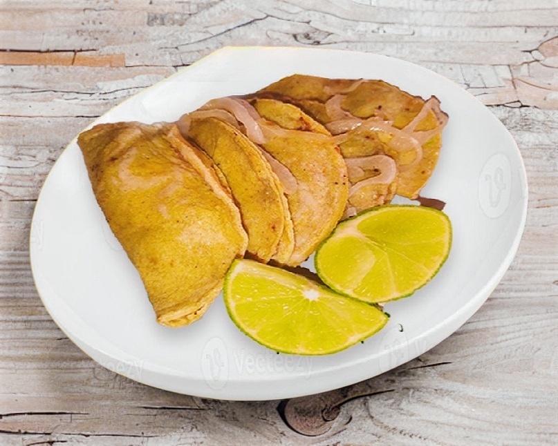 2 tacos papa, 2 tacos de chicharron, 1 taco de frjol, Limon y salsa