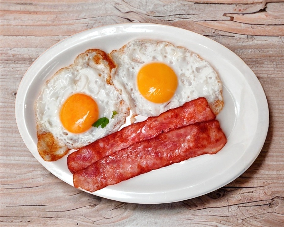 4 Mini Hotcakes Mermelada Fresa, Huevos revueltos, 2 Salchichas con tocino y salsa barbecue