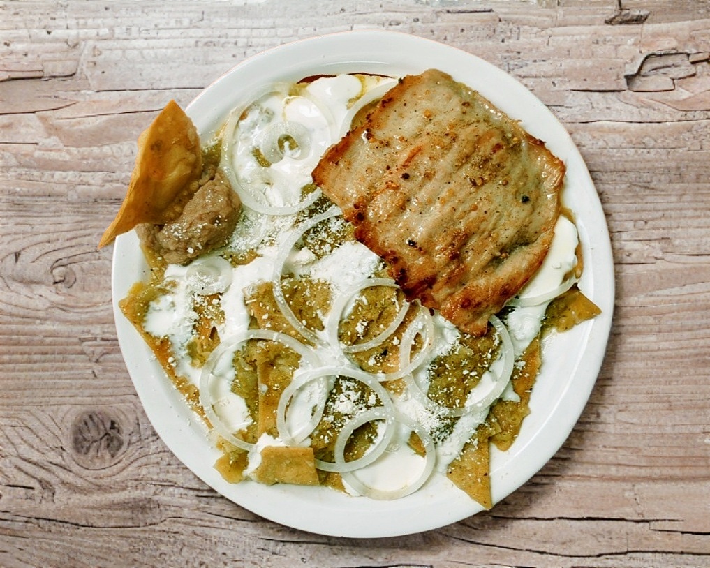 Chilaquiles, Crema, Cebolla, Frijoles Refritos, Totopos, Queso, Bistec de puerco