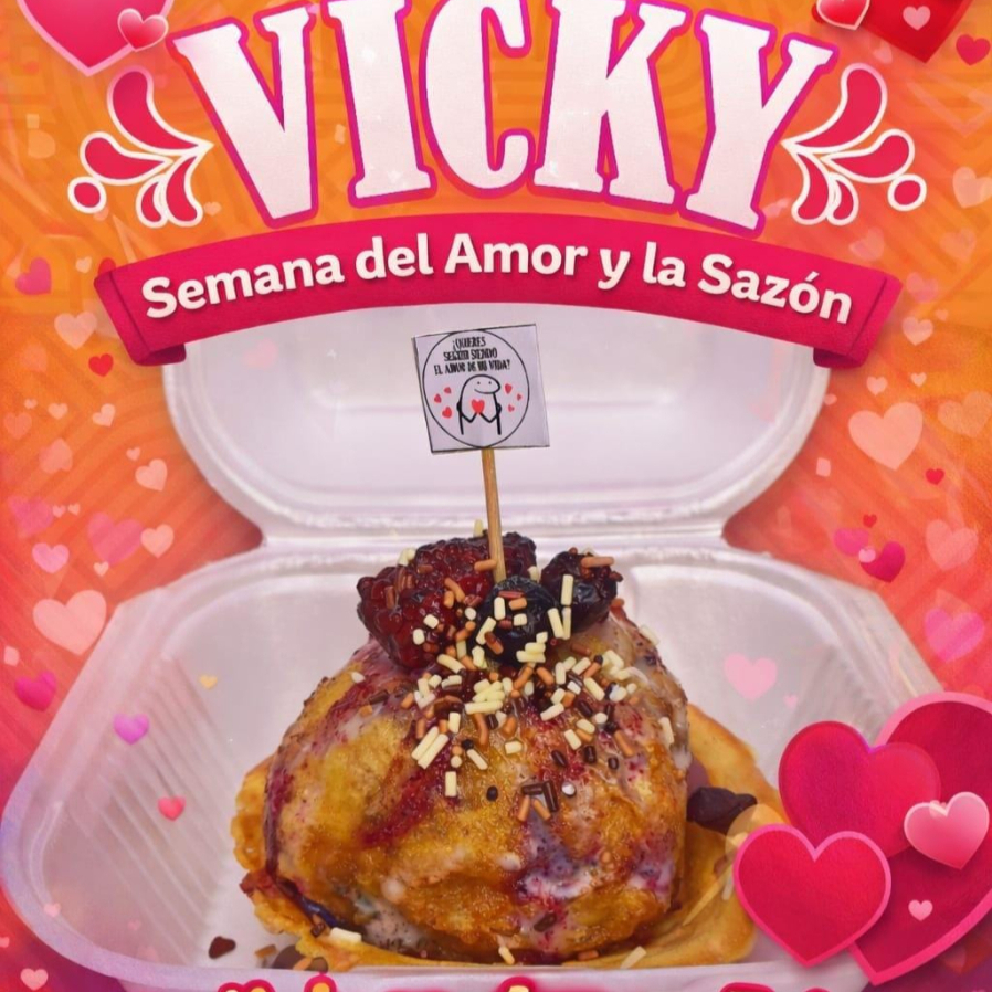 1 wafflee en forma de canasta con una bola de helado tempura de cookie cream, con topings a elegir, futos rojos y etiqueta personalizada