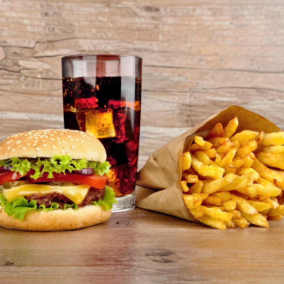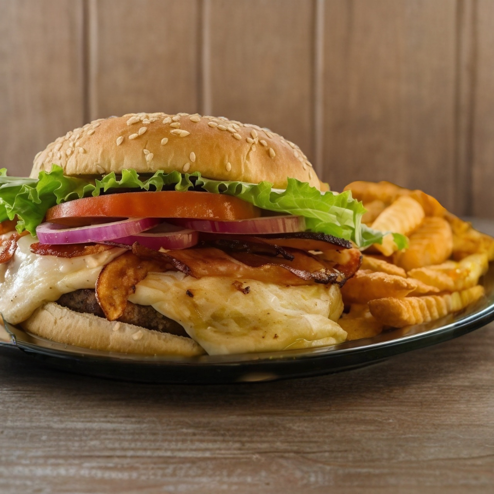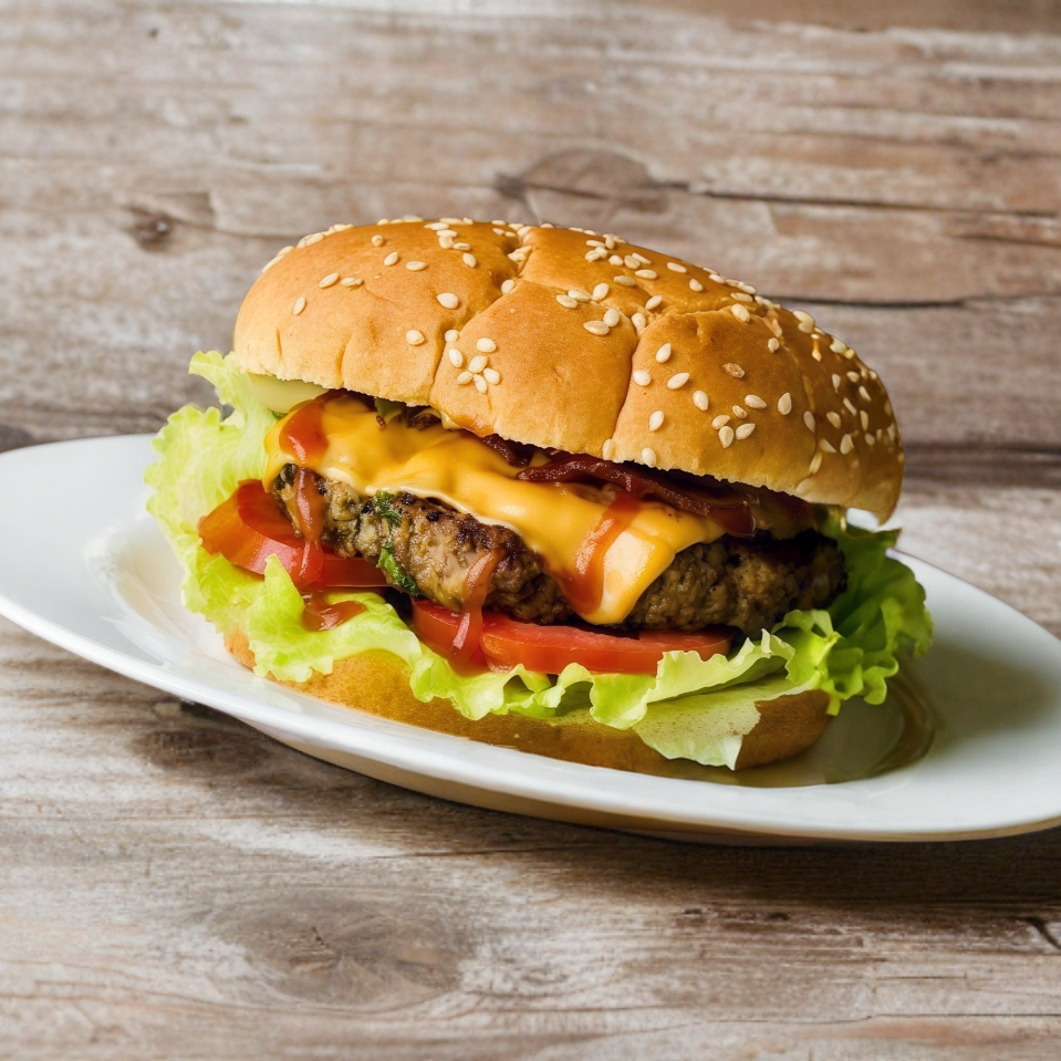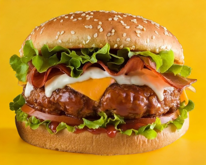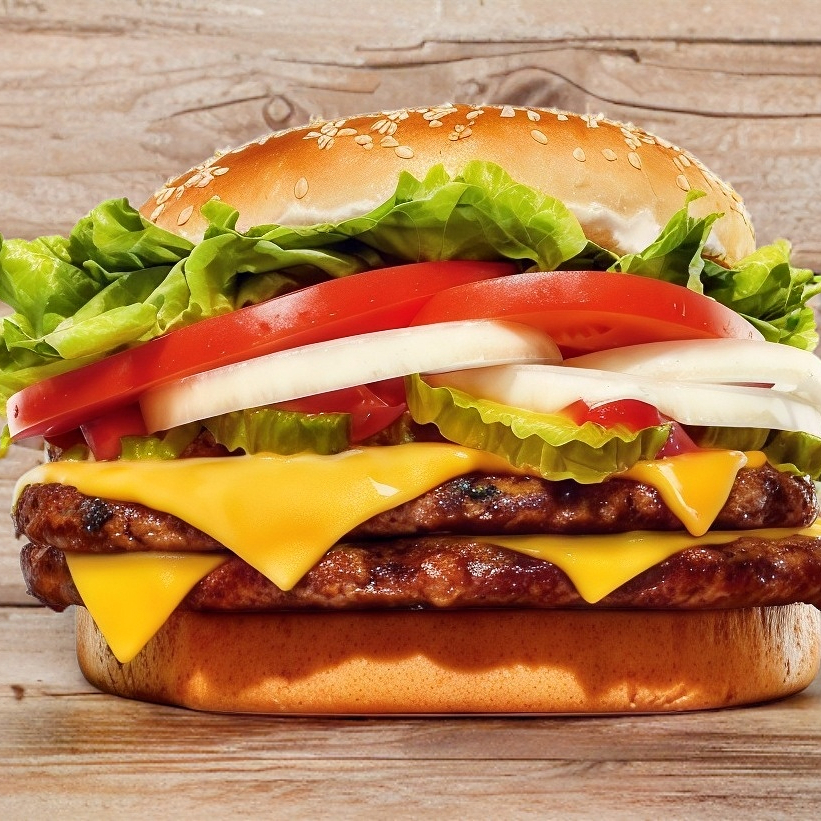Lechuga, jitomate, cebolla, doble carne de res de 100 g y doble queso amarillo.