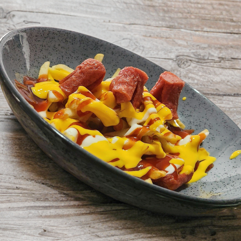 Deliciosos salchipulpos de papas fritas con salchicha preparados con mayonesa, catsup, salsa y queso.