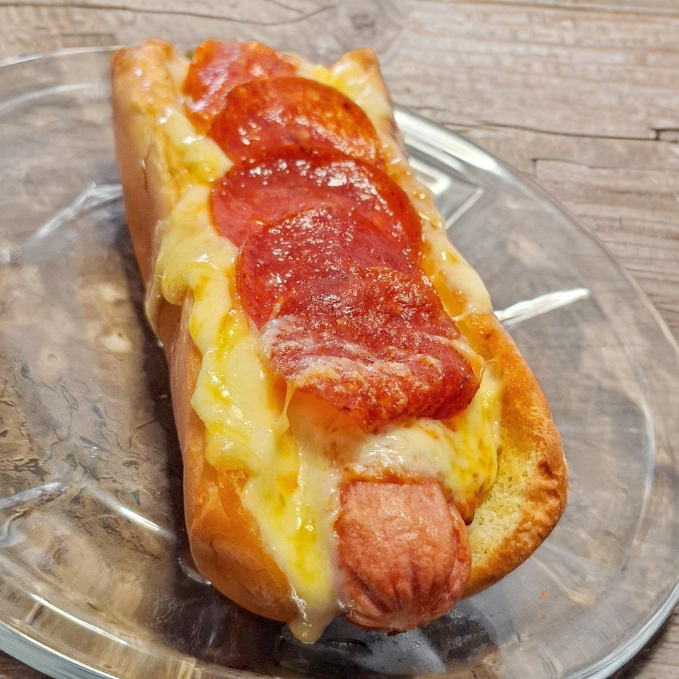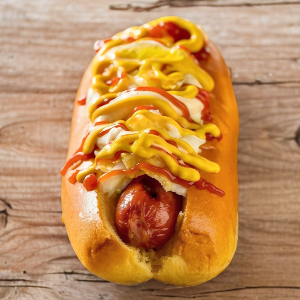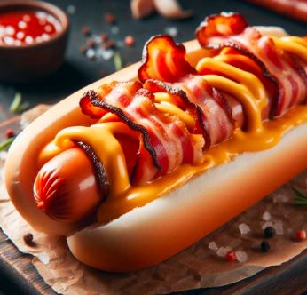 Hot dog con salchicha y tocino, cubierto con quesillo, queso mozzarrela y peperoni, acompañado con jitomate, cebolla, mayonesa, catsup, mostaza y picante a elejir.