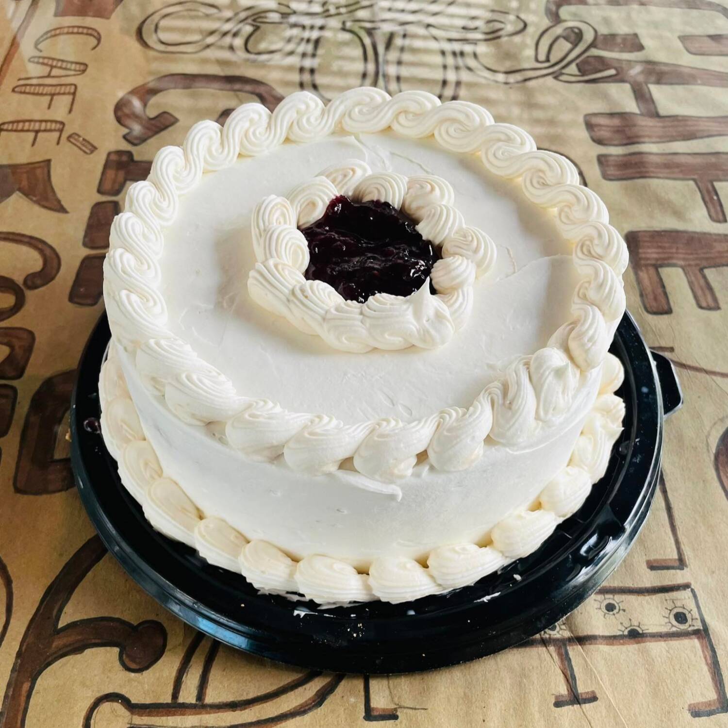 Base de galleta María con relleno de flan de queso crema, bañado con mermela de zarzamora y crema batida