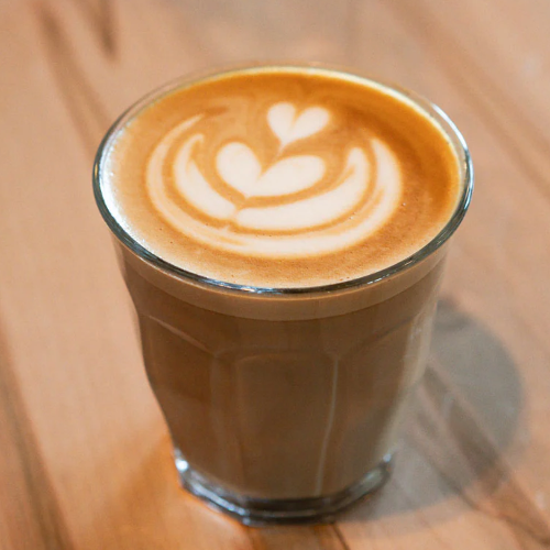 Café con leche y vainilla con espresso, leche vaporizada y una fina capa final de leche espumosa encima.