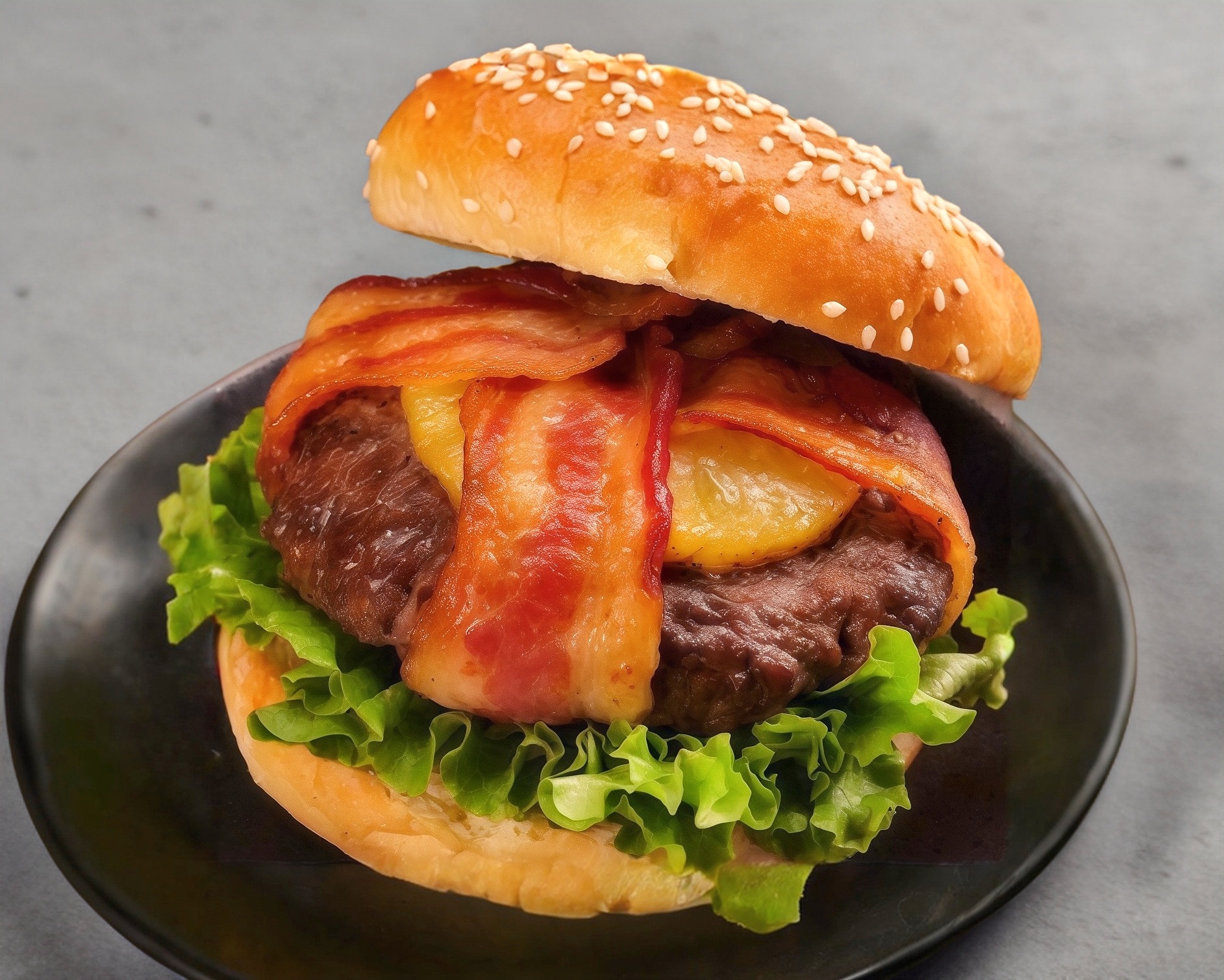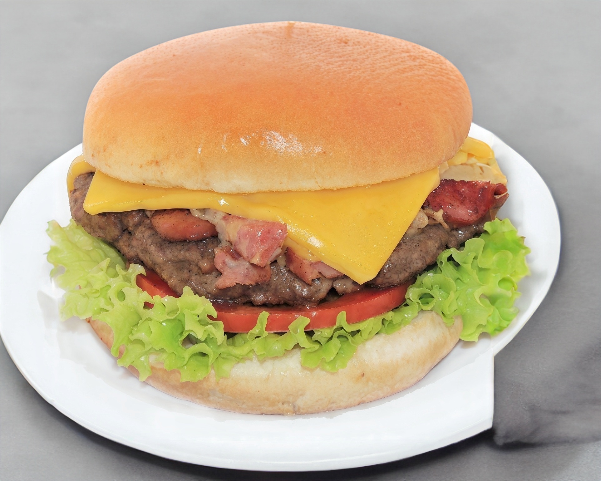 Carne de res, tocino, aros de cebolla, jitomate, lechuga y salsa BBQ.