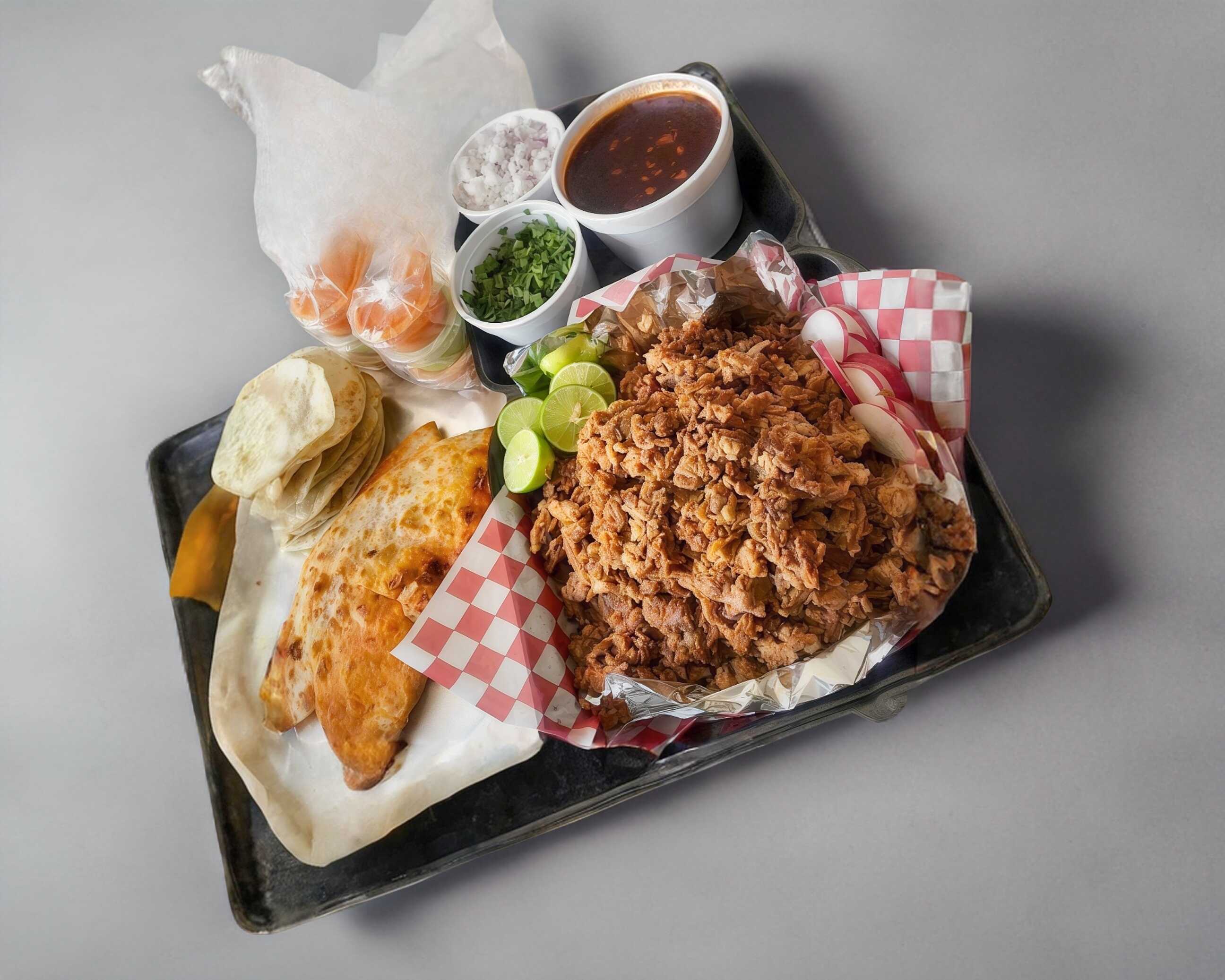 Una Deliciosa quesadilla doradita de queso mozzarella con jugosa carne de birria de res, Aparte ( cilantro, cebolla, limón y salsa)