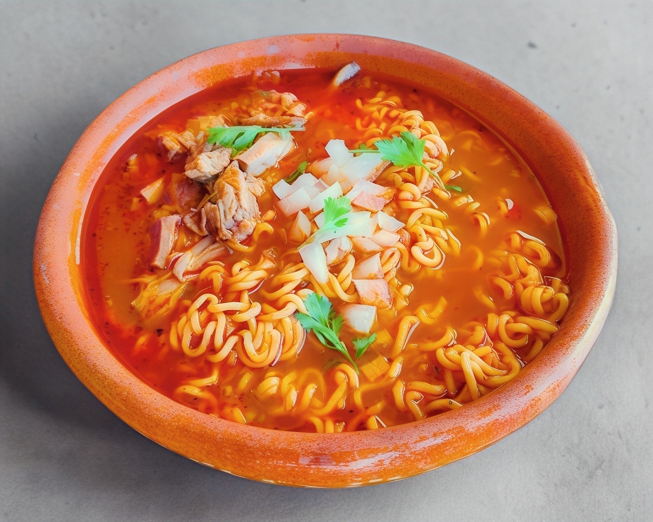 Tazón grande de Fideos de Ramen (no es maruchan) cocinados en consomé acompañados de carne de birria, cilantro, cebolla y limón