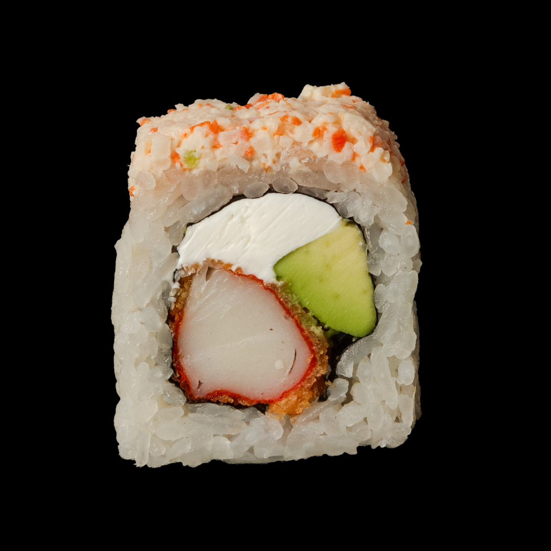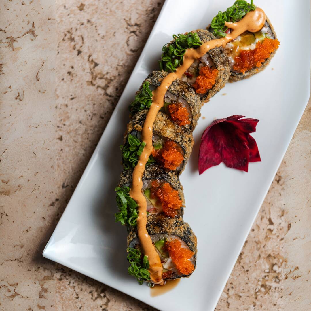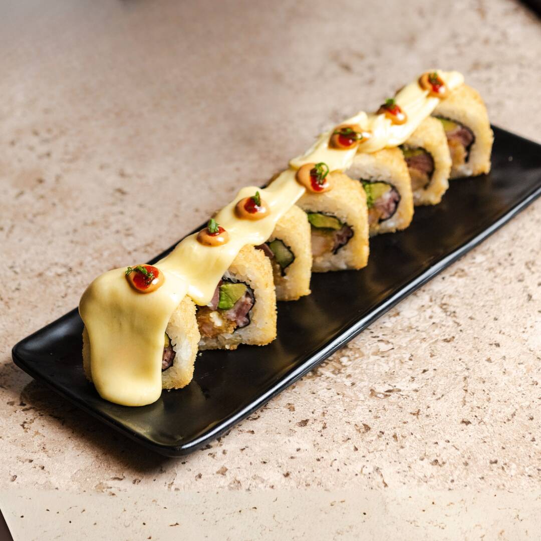 Por dentro: Philadelphia, aguacate y cangrejo empanizado. Por fuera: Nori empanizado, salsa de anguila, aderezo de chipotle, topping de masago coronado con cebollín.