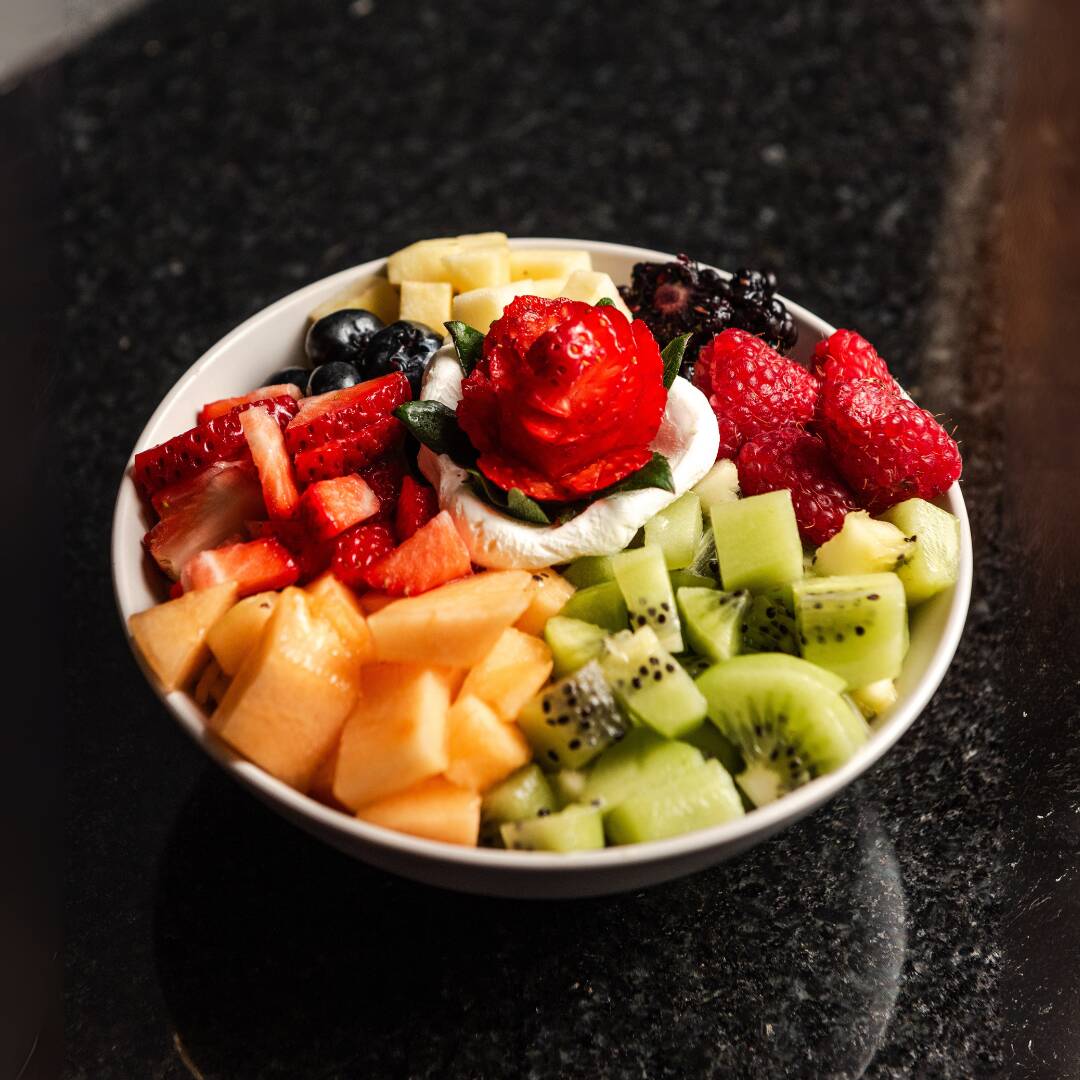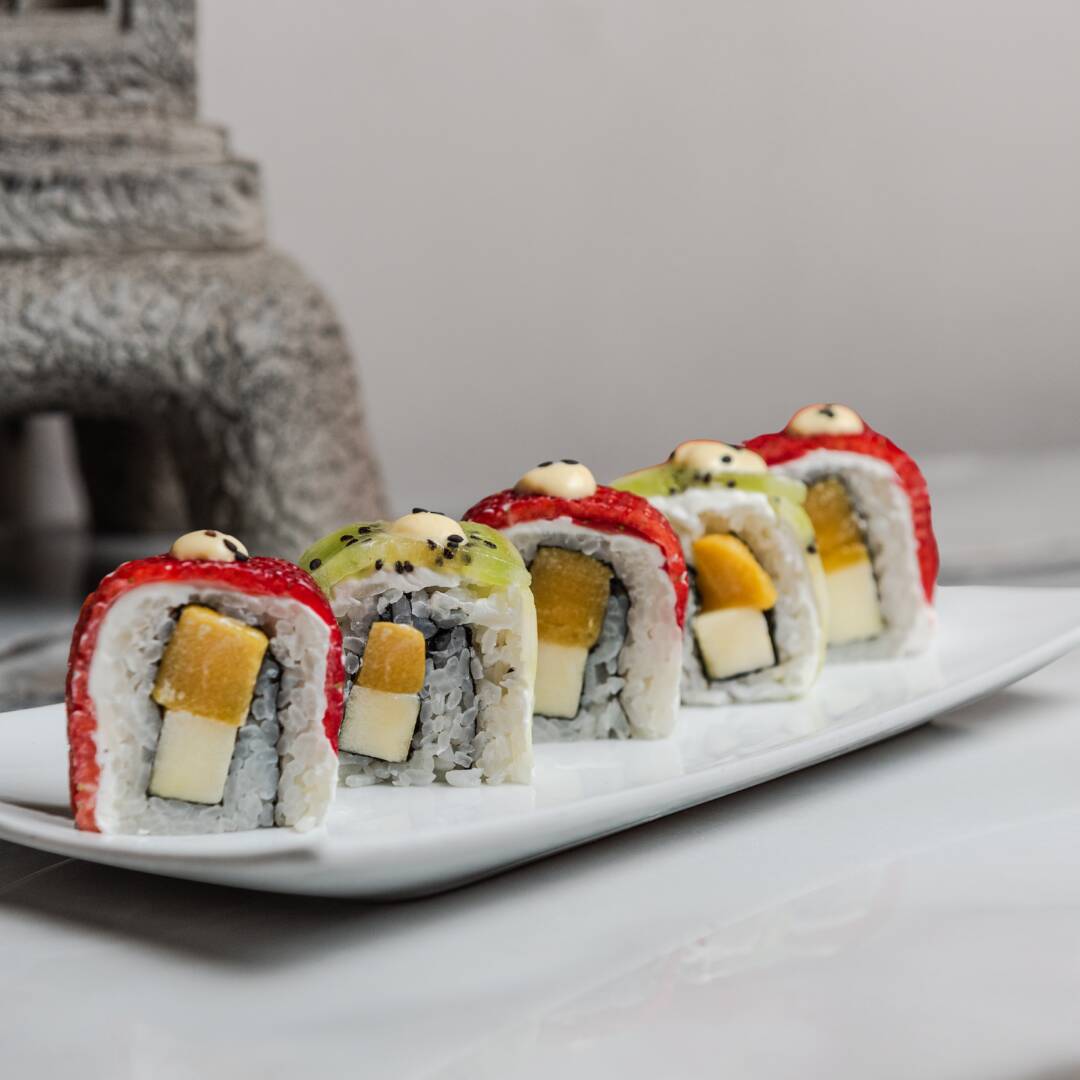 Arroz sushi, mango, fresa, kiwi, melón, zarzamora, blueberry y cubitos de queso philadelphia.
