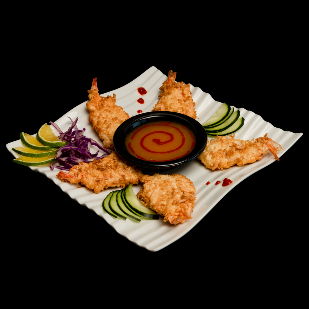 Camarón, empanizados en coco, acompañados en salsa de naramango. (5 piezas)