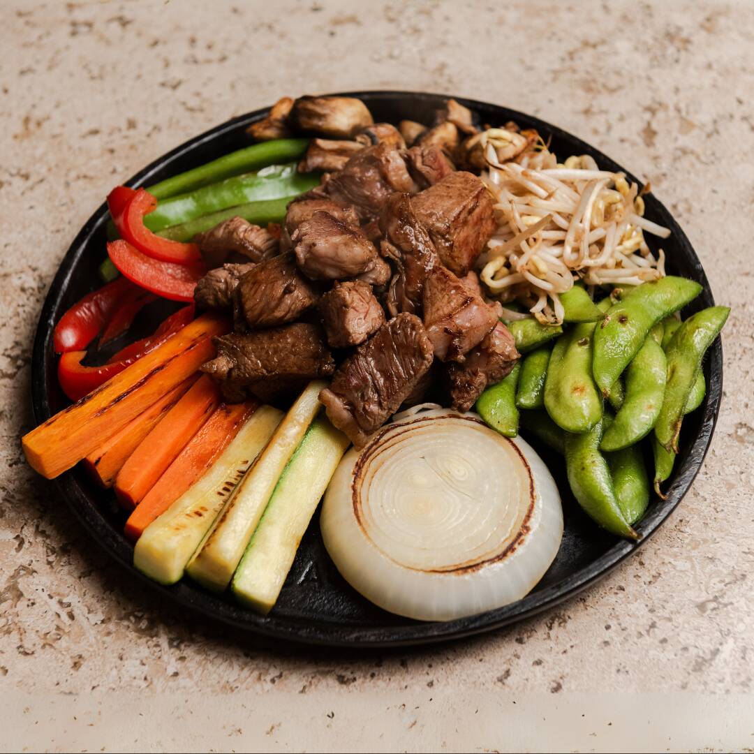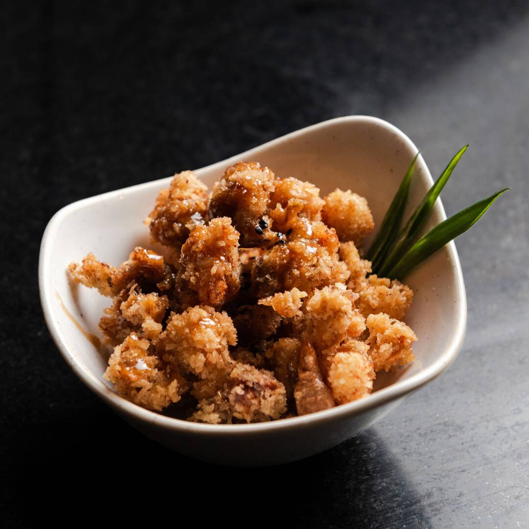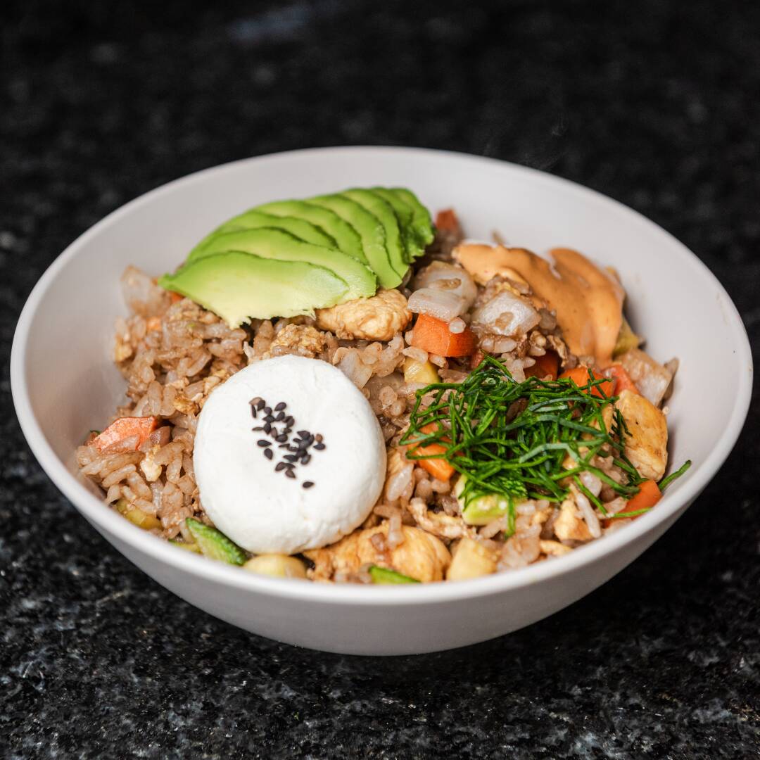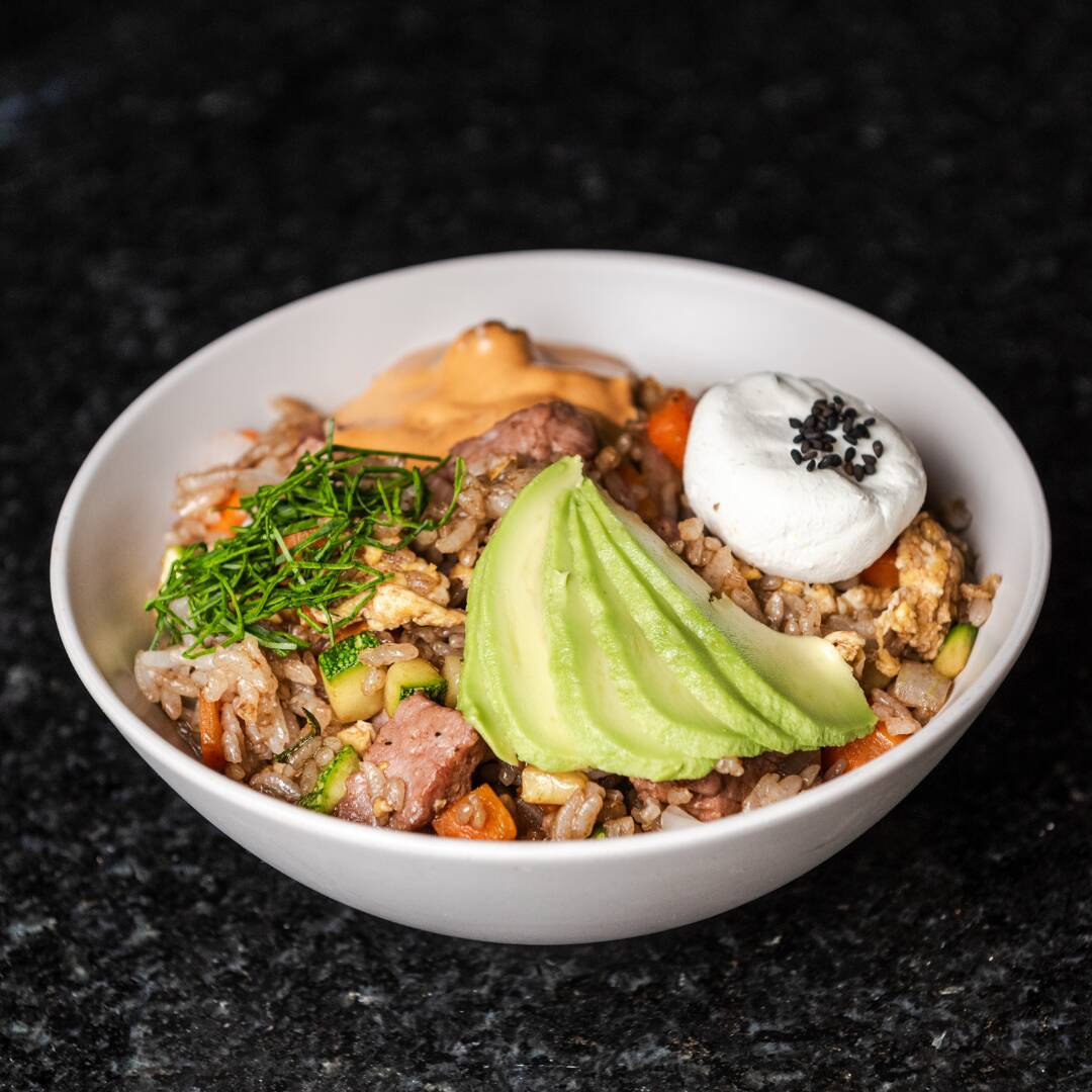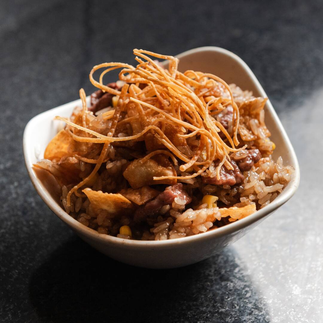 Arroz frito con salsa koki, arrachera, granos de elote y hojuelas crujientes.