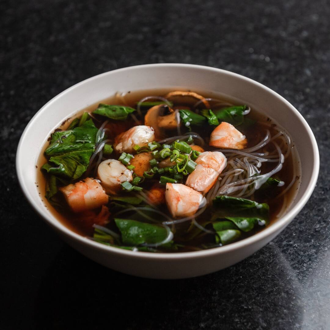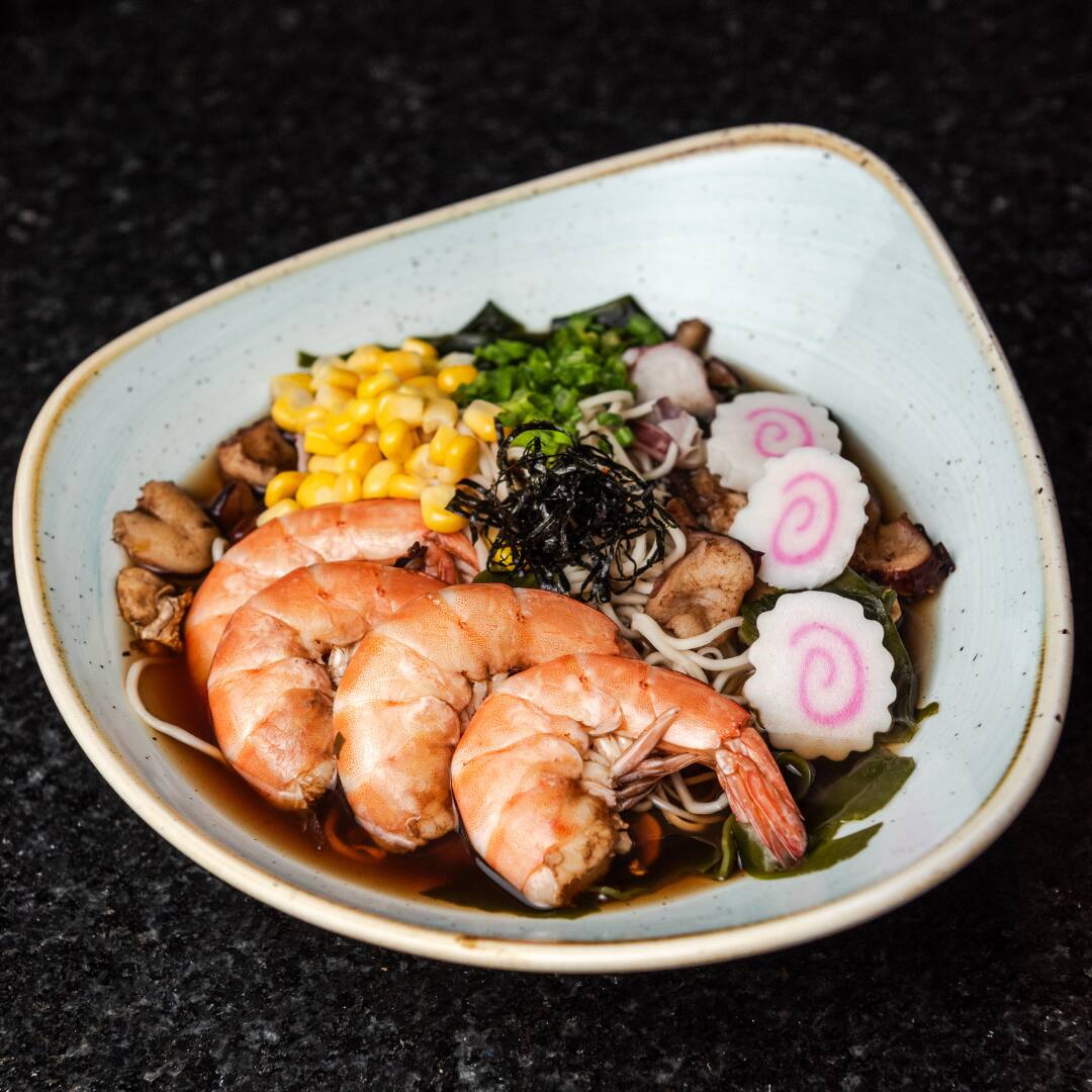 Fideos de arroz, fondo camarón, camarón, pulpo, espinaca, setas, granos de elote, germen de soya, cebollín y naruto.