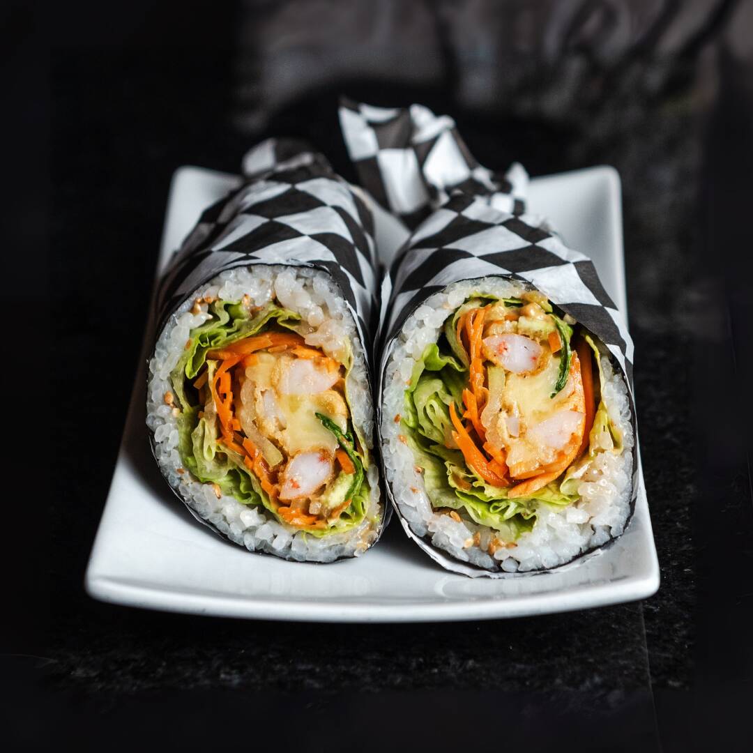 Camarón, aguacate, manchego, lechuga, zanahoria, pepino, aderezo de chipotle y salsa de anguila.