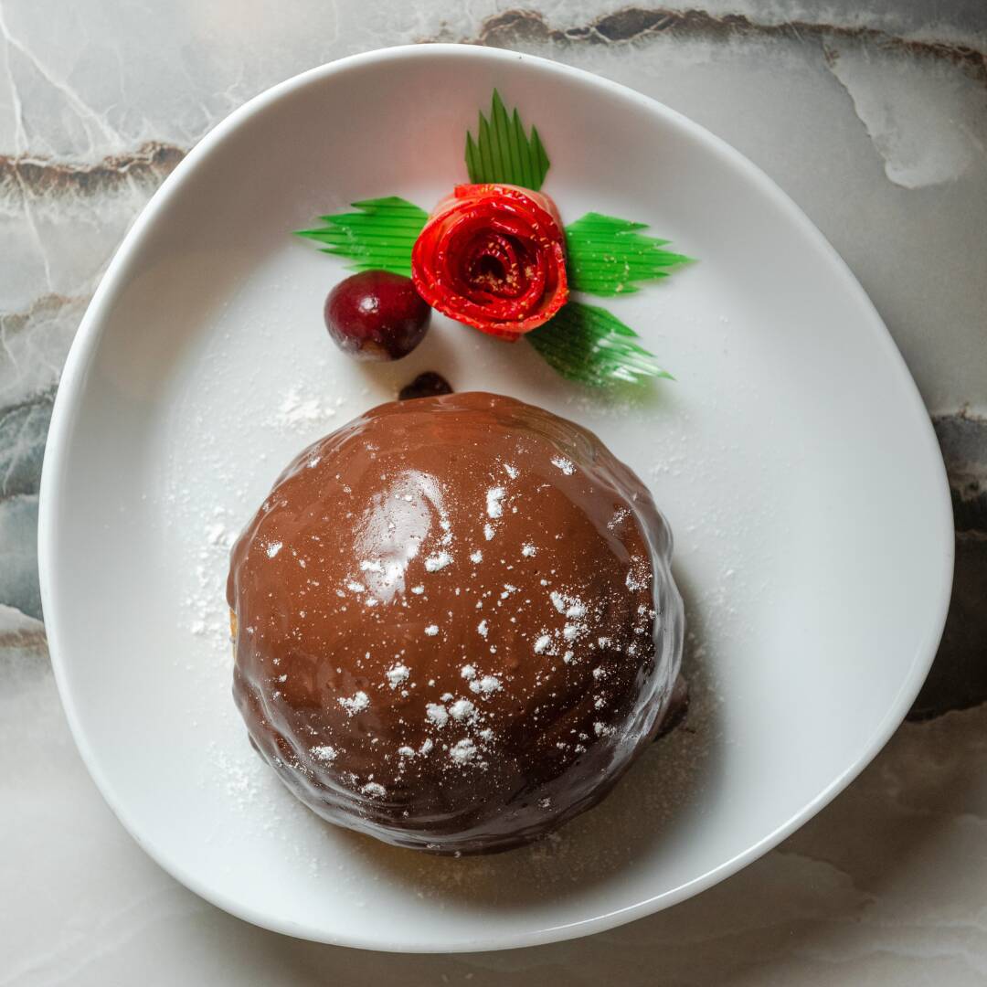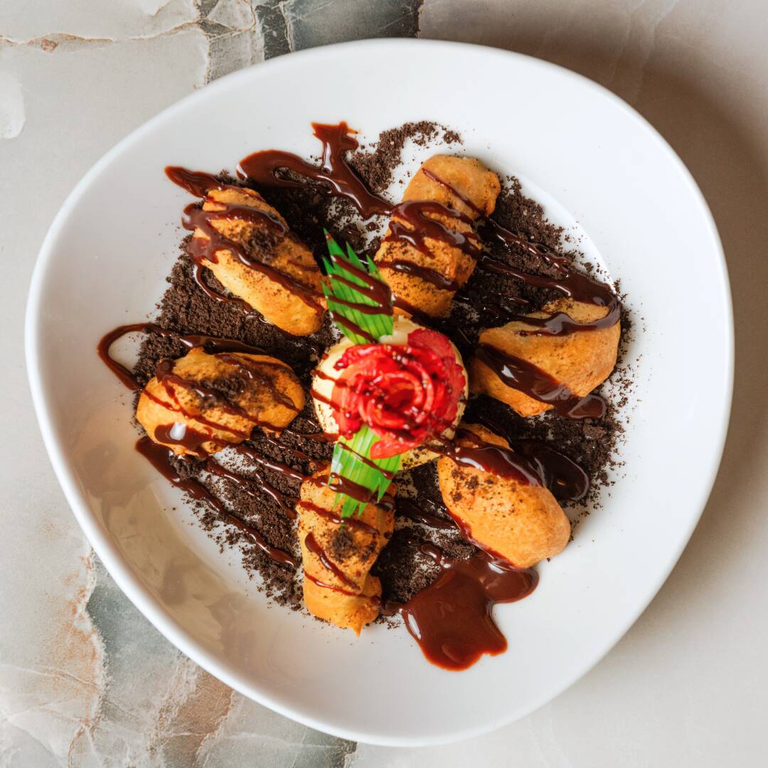 Helado frito, cubierto con mango o nutella, chocolate, cajeta o fresa.