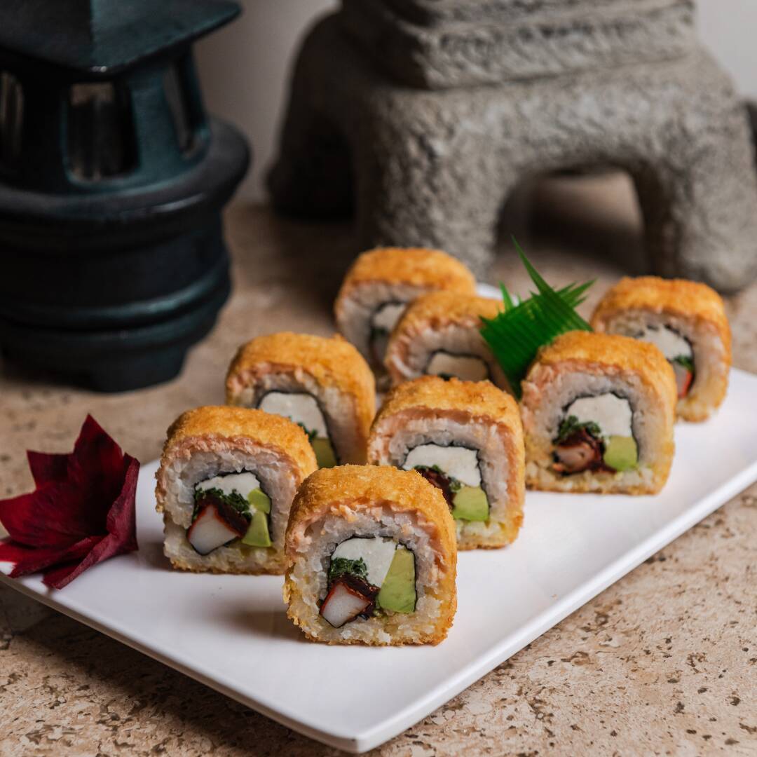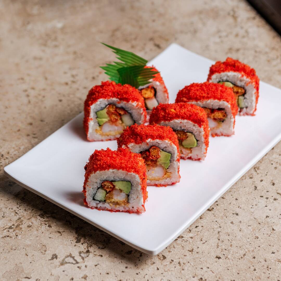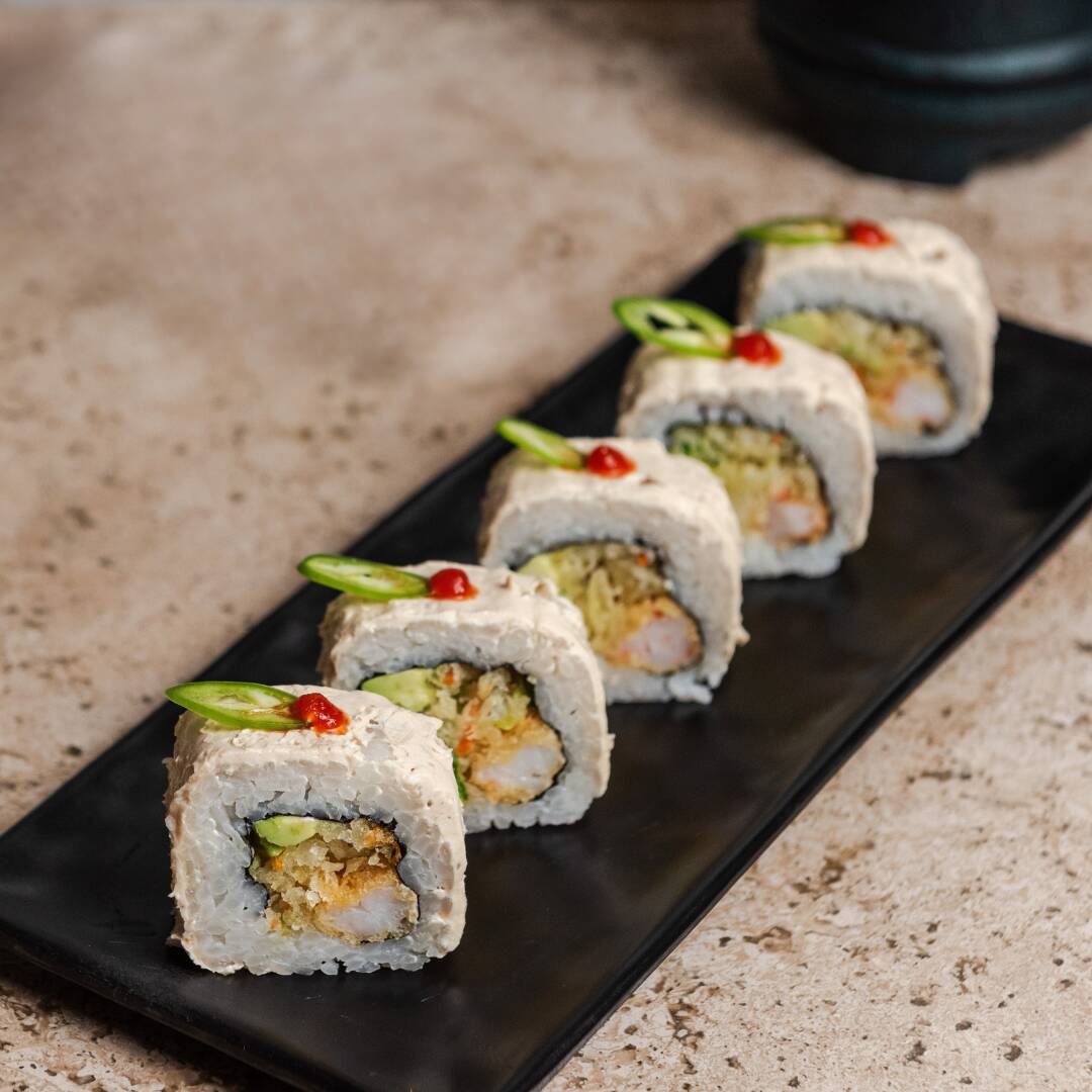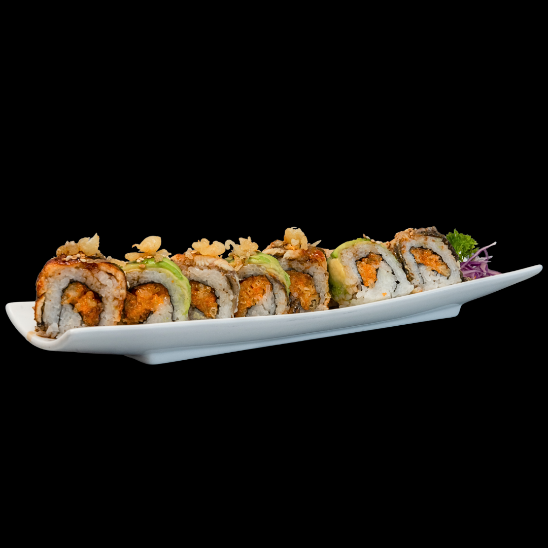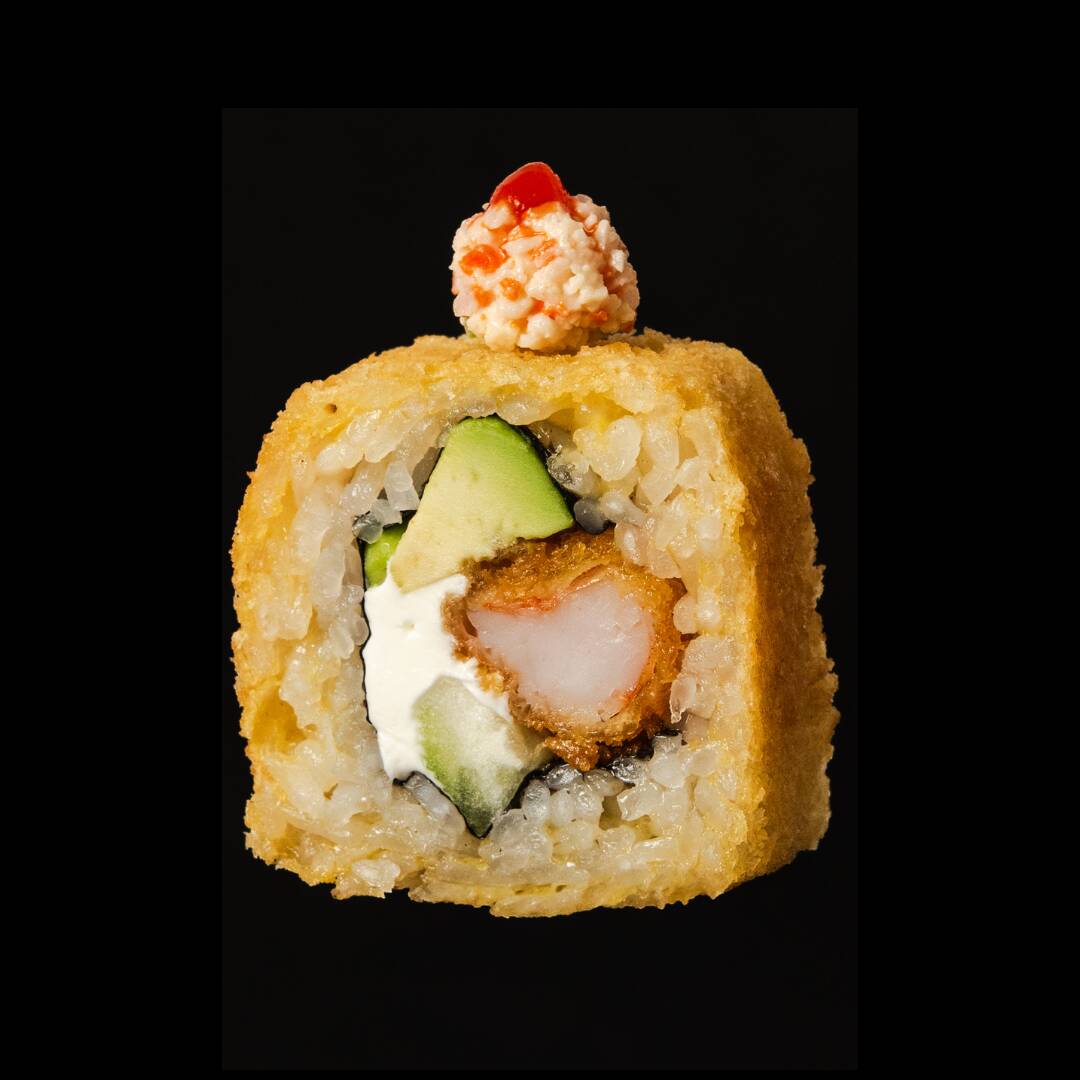 1 Rollo de sushi de 10 bocados por dentro: Camarón empanizado, philadelphia, pepino y aguacate. Por fuera: Topping de tampico y sriracha.