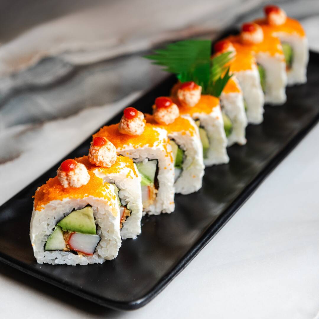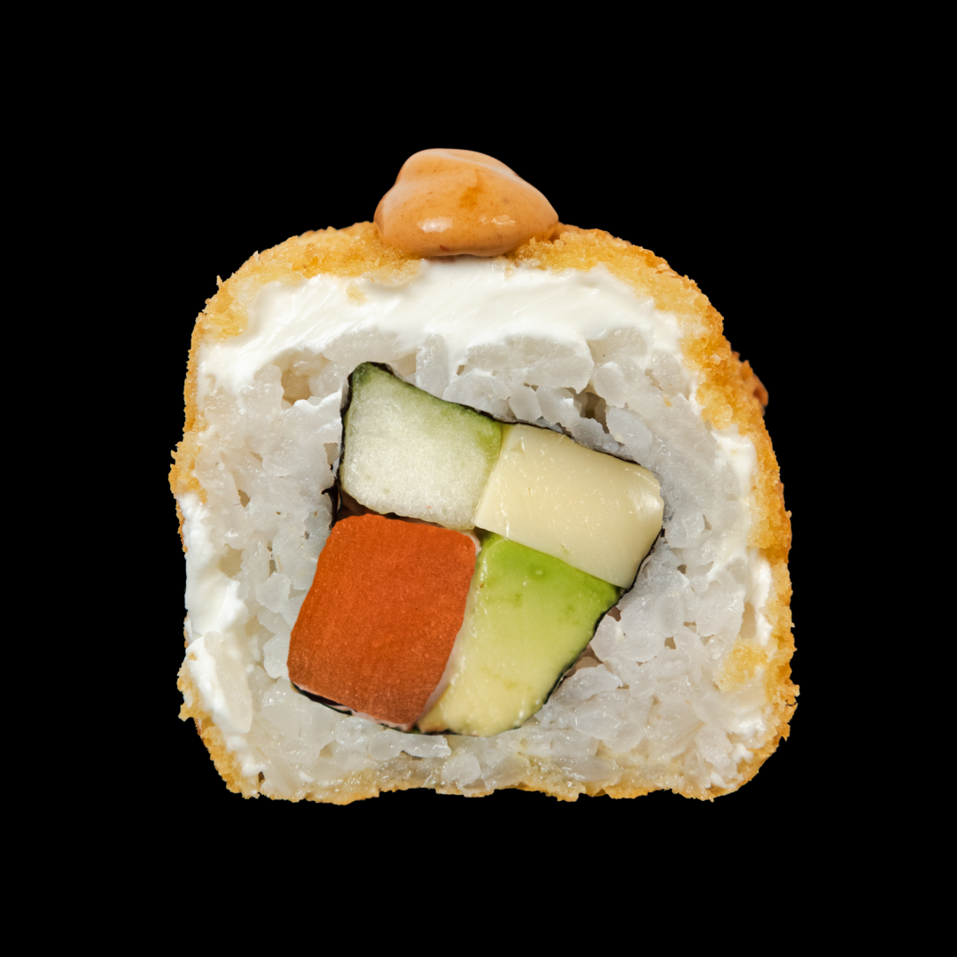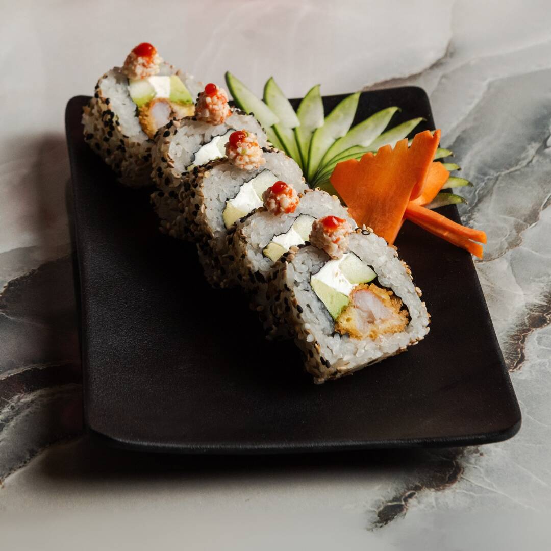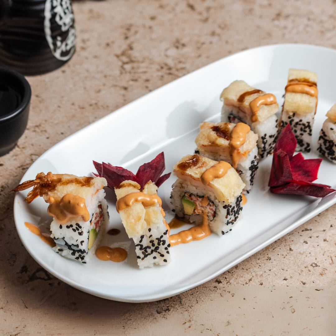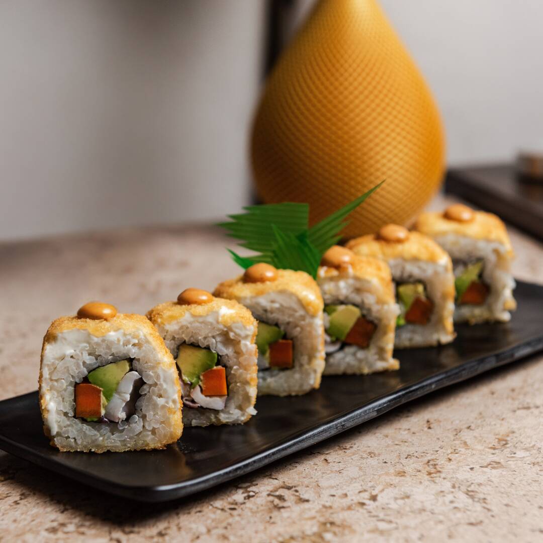 1 Rollo de sushi de 10 bocados por dentro: Camarón empanizado, philadelphia, pepino y aguacate. Por fuera: Topping de tampico y sriracha.